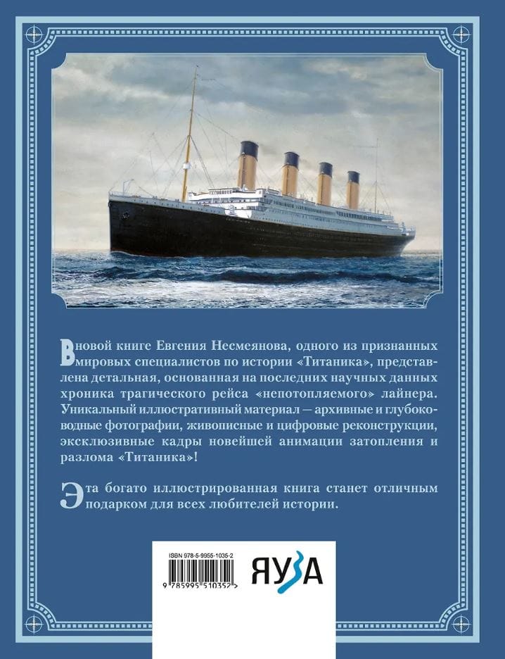 Šī jaunā grāmata, kuras autors ir Jevgeņijs Ņesmejanovs, viens no pasaules vadošajiem Titānika vēstures ekspertiem, piedāvā detalizētu hroniku par "nenogremdējamā" lainera traģisko ceļojumu, pamatojoties uz jaunākajiem zinātniskajiem datiem. Unikālas ilustrācijas ietver arhīva un dziļūdens fotogrāfijas, gleznieciskas un digitālas rekonstrukcijas, kā arī ekskluzīvu, modernu Titānika nogrimšanas un sabrukšanas animāciju! Šī bagātīgi ilustrētā grāmata ir lieliska dāvana jebkuram vēstures entuziastam.