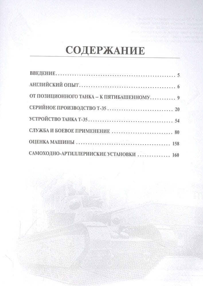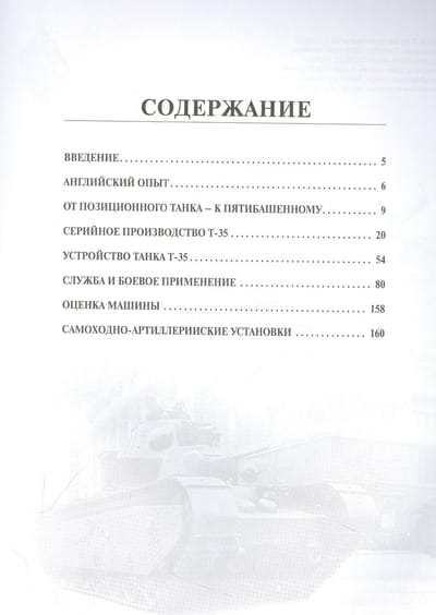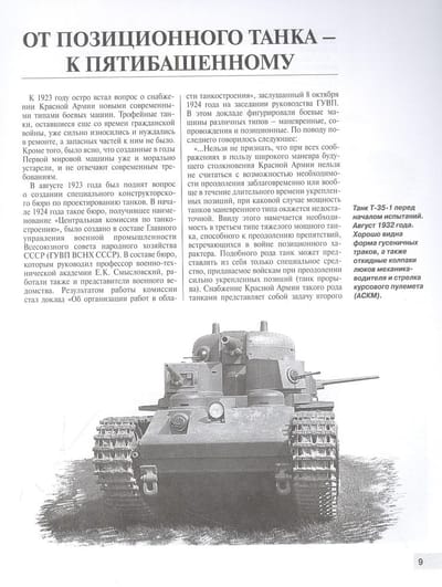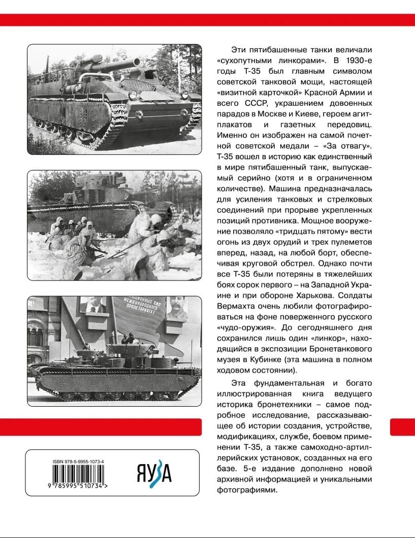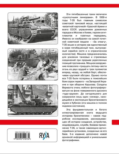 Šos piecu tanku tankus sauca par "sauszemes kaujas kuģiem". Trīsdesmitajos gados T-35 bija galvenais padomju tanku varas simbols, īsta Sarkanās armijas un visas PSRS "vizītkarte", pirmskara parādes Maskavā un Kijevā, aģitācijas plakātu un avīžu rakstu varonis. Tas ir attēlots uz padomju goda medaļas "Par drosmi". T-35 iegāja vēsturē kā vienīgais piecu tanku tanks pasaulē, kas tika ražots masveidā (lai gan ierobežotā skaitā). Transportlīdzeklis bija paredzēts tanku un strēlnieku formējumu pastiprināšanai, izlaužoties cauri nocietinātām ienaidnieka pozīcijām. Jaudīgais bruņojums ļāva "Trīsdesmit piektajam" šaut no diviem lielgabaliem un trim ložmetējiem uz priekšu, uz aizmuguri, uz abām pusēm, nodrošinot apļveida uguni. Tomēr gandrīz visi T-35 tika zaudēti četrdesmit pirmā smagākajās kaujās - Rietumukrainā un Harkovas aizsardzības laikā. Vērmahta karavīriem patika fotografēties uz sakautā krievu "brīnumainā ieroča" fona. Līdz mūsdienām saglabājies tikai viens "kaujas kuģis", kas atrodas bruņutehnikas muzeja ekspozīcijā Kubiņkā (šī mašīna ir pilnā darba kārtībā). Šī fundamentālā un bagātīgi ilustrētā vadošā bruņutehnikas vēsturnieka grāmata ir vispusīgākais pētījums, kas stāsta par T-35 rašanās vēsturi, konstrukciju, modifikācijām, ekspluatāciju, kaujas pielietojumu, kā arī pašgājējām artilērijas vienībām, kas veidotas uz tā bāzes. Piektais izdevums papildināts ar jaunu arhīvu informāciju un unikālām fotogrāfijām.