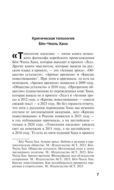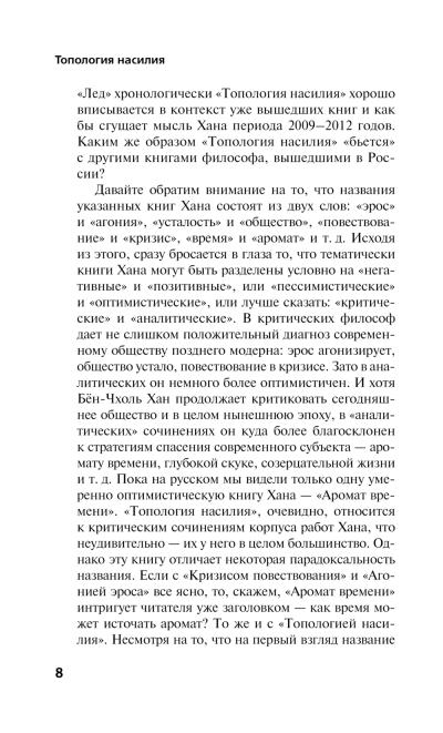. Hāns ierosina vardarbības vēsturi skatīt kā nepārtrauktu transformāciju kaskādi. Mūsdienās katrs no mums ir gan izpildītājs, gan upuris, un pati vardarbība kļūst pozitīva un neatšķirama no tās pretstata - brīvības. Vai efektivitāti un produktivitāti, pēc kuras ikviens tiecas augstas konkurences darba tirgū, var uzskatīt par vardarbību? Vai veiksmīga cilvēka greznais dzīvesveids patiešām ir vardarbība pret sevi? Ko darīt, lai kļūtu veselīgāks un laimīgāks? Kā jebkura laba filozofiska grāmata, arī The Topology of Violence piedāvā pietiekami plašu perspektīvu, lai izvirzītu šos jautājumus un mēģinātu uz tiem rast atbildes