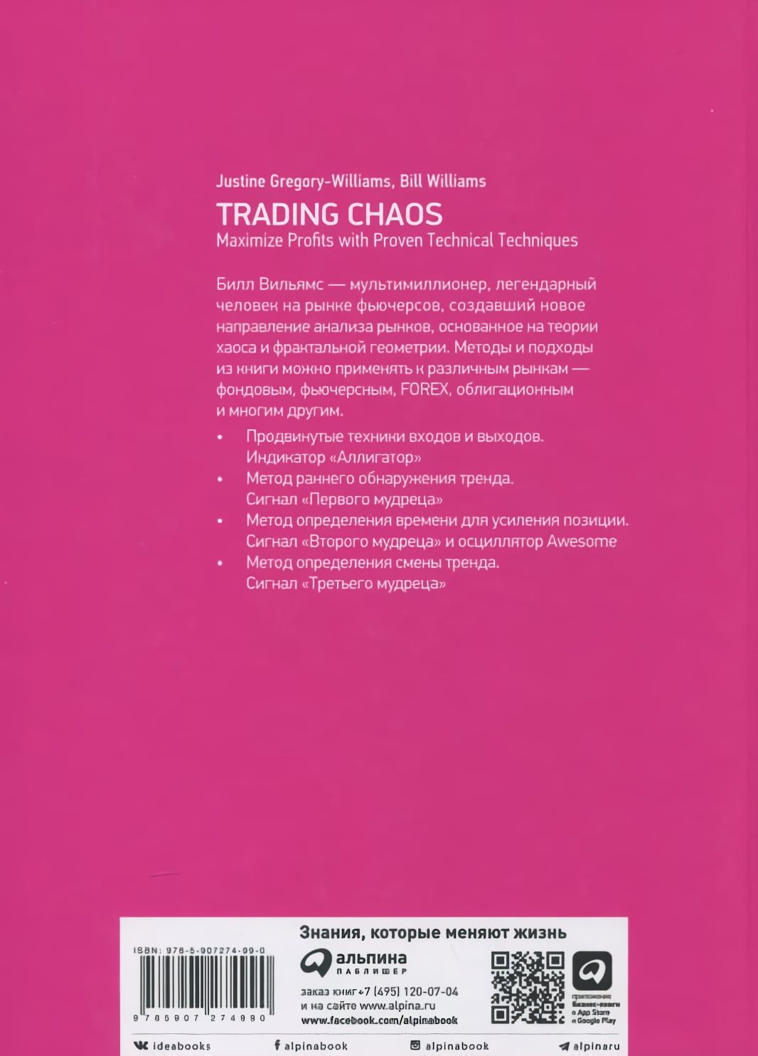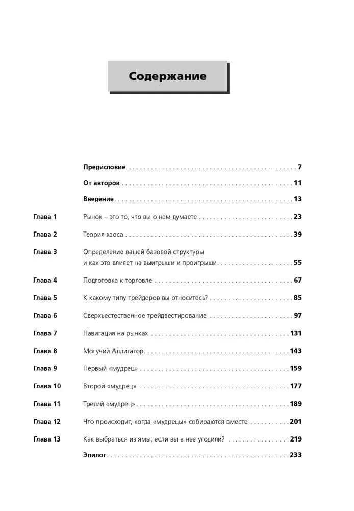 Bils Viljamss ir multimiljonārs, leģendārs cilvēks nākotnes līgumu tirgū, kurš radīja jaunu tirgus analīzes virzienu, kas balstīts uz haosa teoriju un fraktālu ģeometriju. Neraugoties uz daudziem jauniem terminiem un jēdzieniem (kas ir detalizēti izskaidroti), grāmata būtībā ir uzrakstīta ļoti vienkārši un visiem saprotami. Tā jums parādīs, kā jūs varat radikāli uzlabot tirgus kustības prognožu kvalitāti un savlaicīgi noteikt bullish un bearish tendences. Grāmatā aprakstītās metodes un pieejas var izmantot dažādos tirgos - akciju, nākotnes līgumu, FOREX, obligāciju, indeksu un daudzos citos. Liela uzmanība grāmatā pievērsta tirdzniecības psiholoģijai - grāmata ar daudziem piemēriem parāda, ka ieguvumus, ko jūs gūstat no tirdzniecības un investēšanas, nosaka tas, kas notiek jūsu iekšienē. Grāmata ir paredzēta tirgotājiem, investoriem un finanšu analītiķiem.