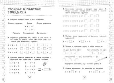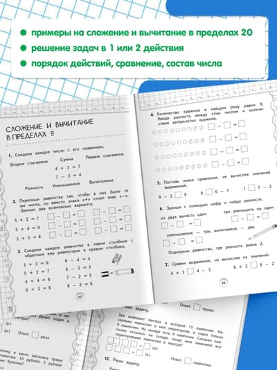 Šo mācību grāmatu no izdevniecības Eksmo, kas atbilst Federālajam valsts izglītības standartam, izstrādāja speciālists ar daudzu gadu pieredzi, un tā būs lielisks palīgs pirmklasniekiem matemātikas stundās apgūto prasmju un iemaņu praktizēšanā. Liela skaita saskaitīšanas un atņemšanas uzdevumu, kā arī viena un divu soļu uzdevumu risināšana 20 punktu robežās palīdzēs skolēniem izvairīties no aprēķinu kļūdām un attīstīt skaitīšanas prasmes līdz automātismam. Izmantojot šo grāmatu, skolēni pārskatīs tādas tēmas kā "Daudzums", "Skaitļu sastāvs" un "Salīdzināšana"; viņi iemācīsies analizēt informāciju un izprast mācību uzdevumu; viņi arī varēs nostiprināt apgūto materiālu, aizpildīt zināšanu nepilnības, attīstīt matemātiskās prasmes un uzlabot savu akadēmisko sniegumu.