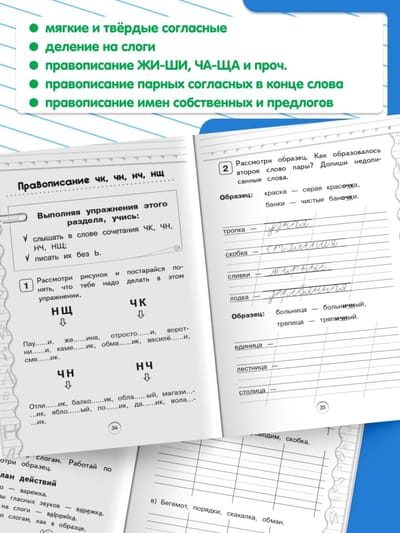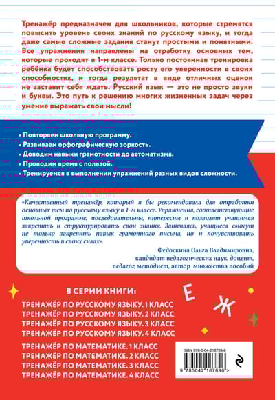 Šī krievu valodas rokasgrāmata no izdevniecības “Eksmo” ir sagatavota saskaņā ar Federālo valsts izglītības standartu pamatskolai un to var izmantot kopā ar jebkuru pašreizējo pirmās klases mācību grāmatu. Šis ērts mācību līdzeklis ar saistošu, modernu izkārtojumu palīdzēs bērniem uzlabot lasītprasmi, aizpildīt nepilnības, kā arī padziļināt un sistematizēt zināšanas. Kursa laikā skolēni ne tikai praktizēs tādas svarīgas mācību programmas tēmas kā ЖИ-ШИ, ЧА-ЩА, ЧУ-ЩУ, ЧК, ЧН, НЧ, НЩ pareizrakstību, vārdu galos esošos līdzskaņus, īpašvārdus, prievārdus un citas, bet arī iemācīsies strādāt pēc plāna, tas ir, ievērot noteiktu darbību algoritmu, kas palīdzēs viņiem apzināti pielietot noteikumus. Kad lasītprasme būs attīstīta līdz automātismam, rezultāti stabilu zināšanu un izcilu atzīmju veidā nebūs ilgi jāgaida.