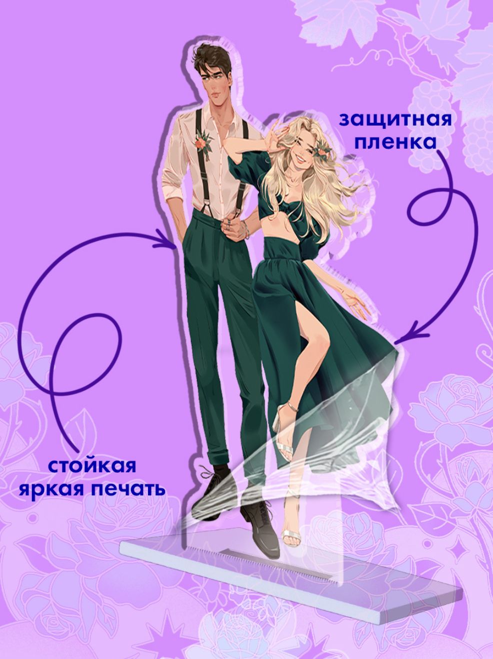 Figūriņas un statīvs ir 10 cm augsti. Šīs akrila figūriņas ir brīnišķīga dāvana Viktorijas Pobedinskajas daiļrades cienītājiem.