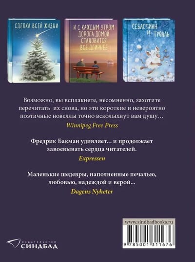 Fredrika Bekmana īsie stāsti ir piesātināti ar tādu pašu maigu humoru un siltumu kā viņa vislabāk pārdotie pilnmetrāžas romāni, kas tagad publicēti četrdesmit trīs valstīs. Tie ir mūsdienīgas līdzības par mūžīgām tēmām vai, ja vēlaties, pasakas pieaugušajiem. Bekmans ir uzticīgs sev — viņš atkal vienkāršā valodā runā par vissvarīgākajām lietām: dzīves jēgu, nāvi, nežēlīgo laika ritējumu un cilvēka atmiņu.