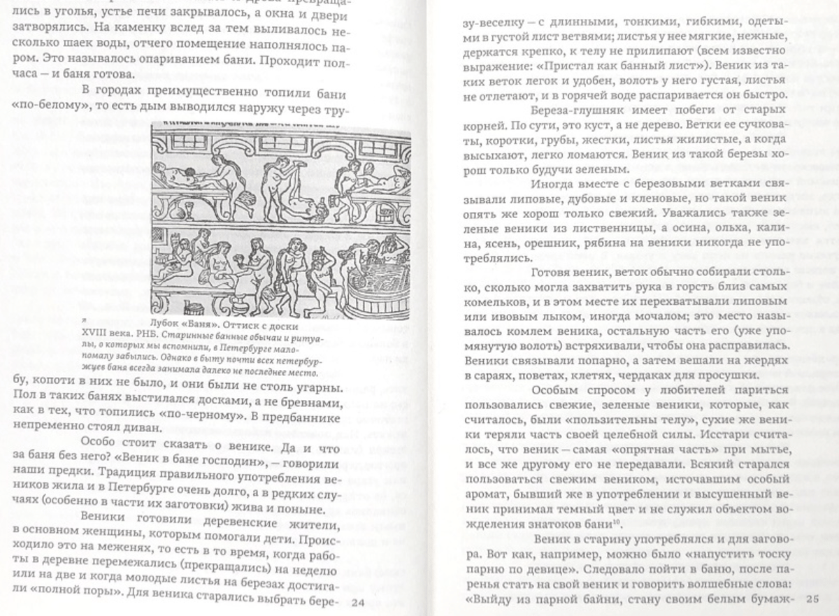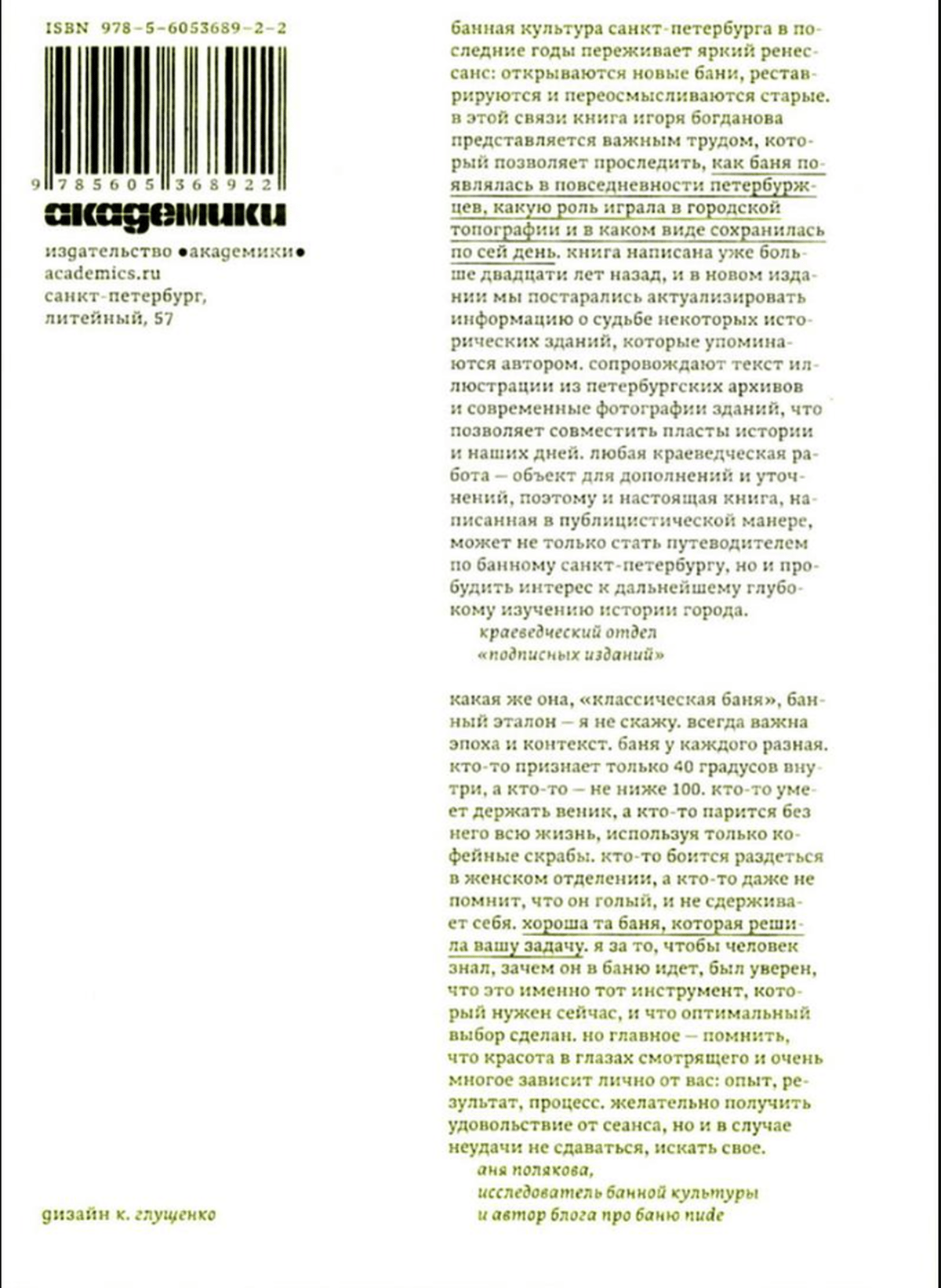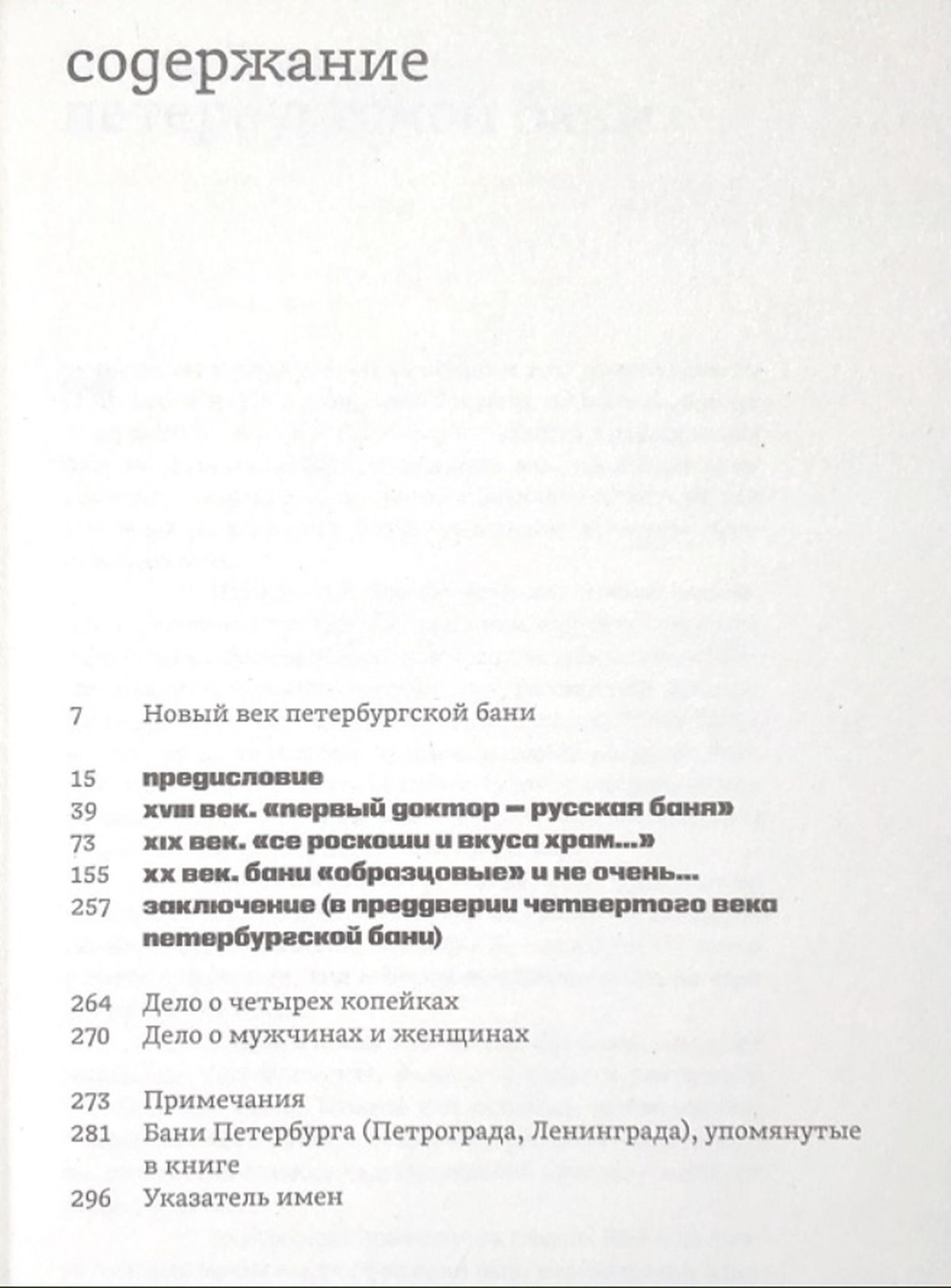Balstoties uz daudziem dokumentāliem, literāriem un memuāriem veltītiem avotiem, vietējais vēsturnieks Igors Bogdanovs pēta Sanktpēterburgas pirtis gan kā nozīmīgu arhitektūras pieminekli, gan kā unikālu kultūras un estētisku parādību. Viņš palīdz mums izsekot, kā pirtis parādījās Sanktpēterburgas iedzīvotāju ikdienas dzīvē, kāda bija to loma pilsētas topogrāfijā un kā tās pastāvēšana līdz pat mūsdienām. Teksts satur daudz aizraujošas un noderīgas informācijas, tostarp seno tehniku un recepšu aprakstus pareizai tvaicēšanai, mazgāšanās un masāžas veikšanai. Tajā detalizēti aprakstīta veco Sanktpēterburgas piršu apkalpošana un vēsture, to īpašnieki un pastāvīgie apmeklētāji. Tekstu papildina ilustrācijas no Sanktpēterburgas arhīviem un mūsdienu ēku fotogrāfijas, kas ļauj mums savienot vēstures slāņus ar mūsdienām.
