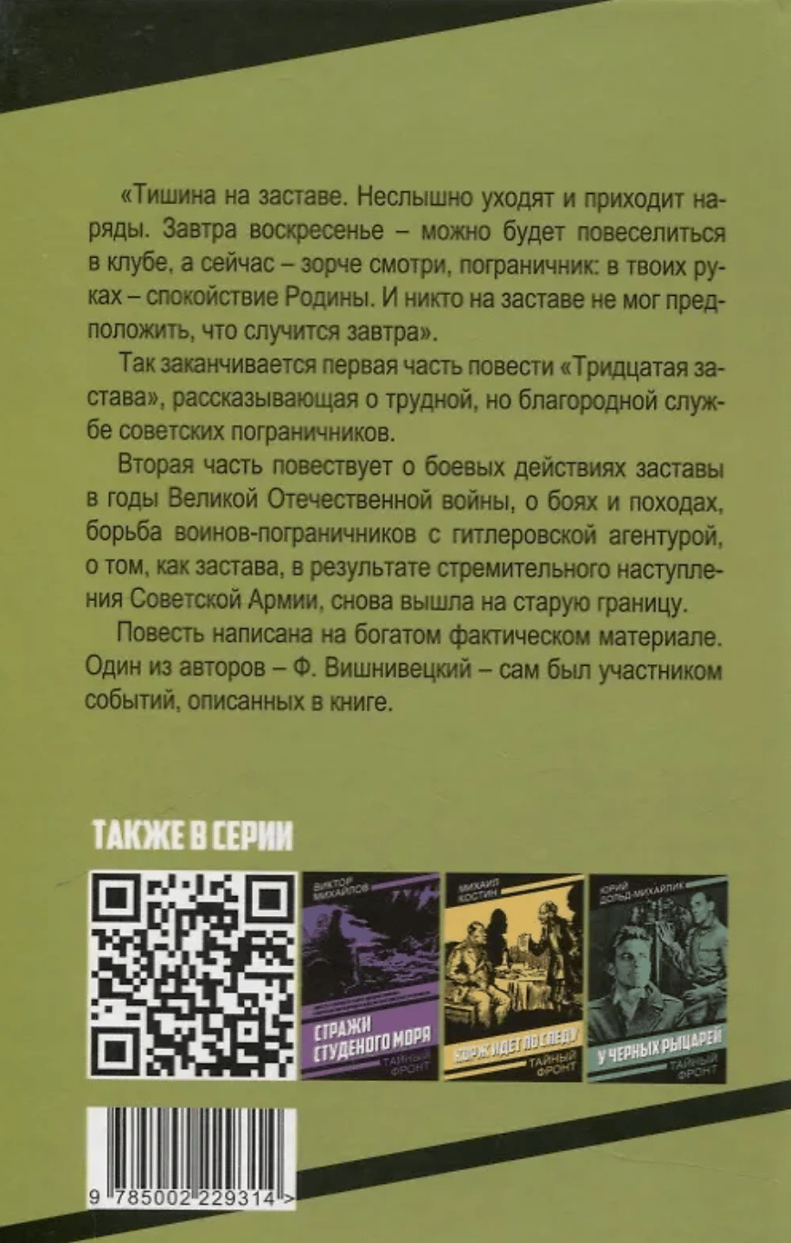 "Priekšpostenī klusums. Patruļas klusībā aiziet un ierodas. Rīt ir svētdiena – vari izklaidēties klubā, bet tagad – esi asāks, robežsarg: Dzimtenes miers ir tavās rokās. Un neviens priekšpostenī nevarēja iedomāties, kas notiks rīt." Tā beidzas stāsta "Trīsdesmitais priekšpostenis" pirmā daļa, kas stāsta par padomju robežsargu grūto, bet cēlo dienestu.