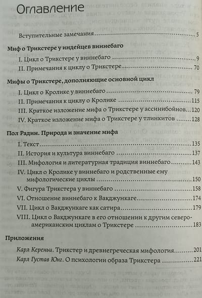 Šajā izdevumā publicēts Ziemeļamerikas Vinnebago indiāņu triksteru mītu tulkojums, ko papildina slavenā antropologa Pola Radina (Paul Radin) kultūras analīze, kā arī K. Kerenija (K. Kerenyi) pētījums par trikstera tēla salīdzinājumu arhaiskajā un antīkajā mitoloģijā un K. G. Junga (C. G. Jung) psihoanalītiskais mitologēmas portrets. Grāmata ir adresēta kulturoloģijas, antropoloģijas, analītiskās psiholoģijas speciālistiem, kā arī visiem, kurus interesē trikstera arhetipa fenomens.