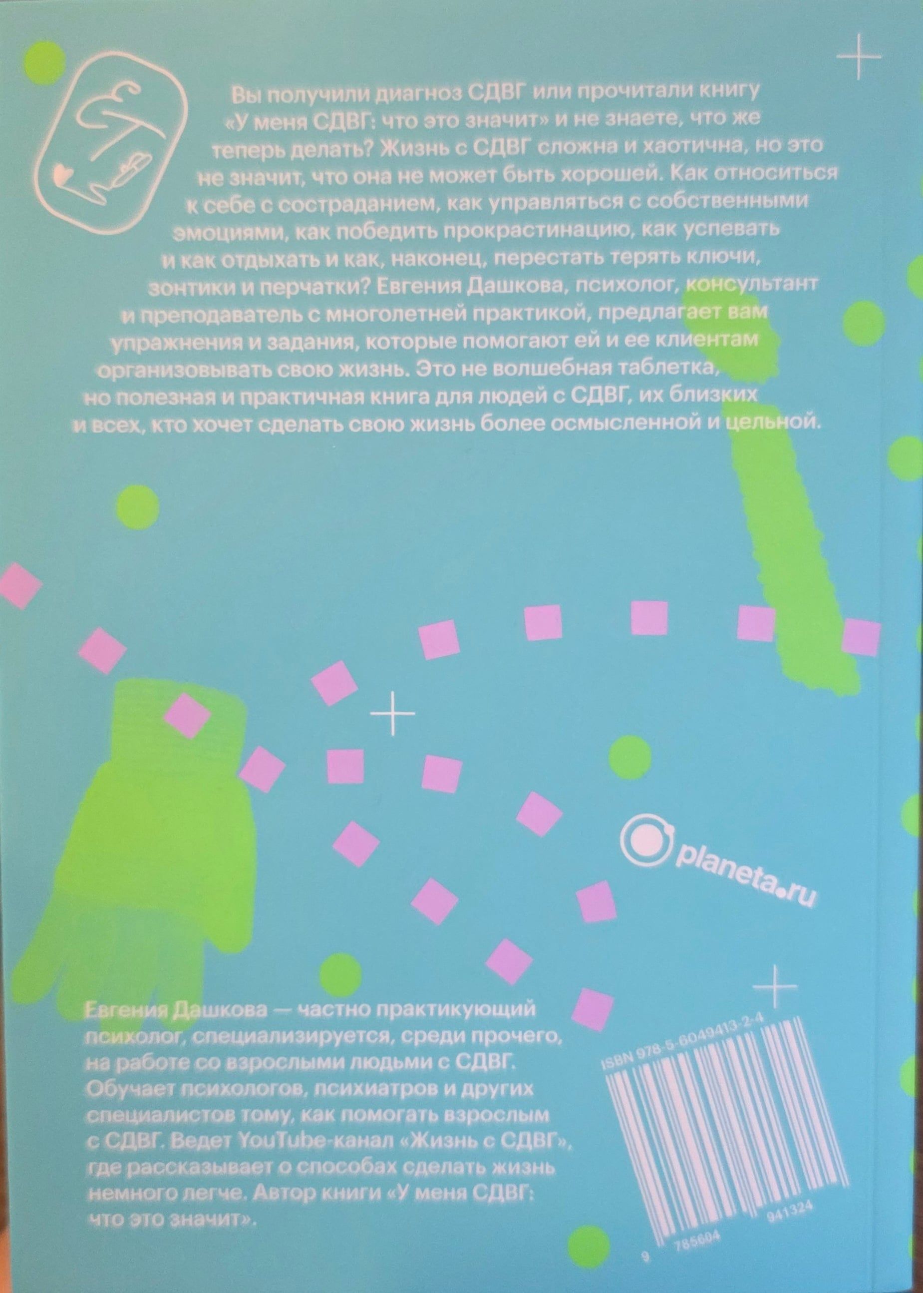 Jevgeņija Daškova, psiholoģe, konsultante un skolotāja ar daudzu gadu pieredzi, piedāvā vingrinājumus un uzdevumus, kas palīdz viņai un viņas klientiem sakārtot savu dzīvi. Šī nav burvju tablete, bet gan noderīga un praktiska grāmata cilvēkiem ar ADHD, viņu tuviniekiem un ikvienam, kurš vēlas padarīt savu dzīvi jēgpilnāku un pilnvērtīgāku.