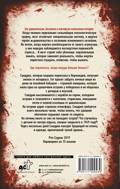 Šis ir pārsteidzošs, traks un meistarīgi uzrakstīts stāsts!Kad cilvēks piedzīvo ārkārtēju psiholoģisku traumu, smadzenes izslēdz emocionālo sistēmu, un cietušais pārdzīvo ļaunprātīgu izmantošanu, atrodoties izmainītas apziņas stāvoklī. Bet tad, kad upuris atbrīvojas no agresora, viņam bieži vien parādās pārdzīvotā stresa sekas... Un smadzenes uzbūvē sev patvērumu - paralēlo atmiņu, kas aizstāj realitāti, lai upuris pārtrauktu ciest, ilūziju, kas ļauj izdzīvot. Kur paslēpties, ja vairs nav kur bēgt? Sandrīna, kas nesen pārcēlusies uz Normandiju, saņem zvanu no notāra. Viņš lūdz, lai viņa savāc personīgās mantas no savas mirušās vecmāmiņas mājas, dīvainas sievietes, kura dzīvoja viena pati uz mazas saliņas piekrastē un ar savu meitu un mazmeitu nebija sazinājusies. Sandrīna izkāpj no kuģa pelēkajā, aukstajā salā un iepazīstas ar tās iedzīvotājiem - veciem cilvēkiem, kuri dzīvo gandrīz pilnīgi izolēti no civilizācijas. Salā valda dīvaina atmosfēra. Sandrīnai ir vajadzīgas tikai dažas stundas, lai saprastu, ka iedzīvotāji slēpj noslēpumus. Bet kāpēc neviens no viņiem nepamet salu? Kas noticis ar bērniem no 1949. gadā steigšus slēgtās brīvdienu nometnes? Dažas dienas vēlāk Sandrīna tiek atrasta klīstam pludmalē, apģērbta drēbēs, kas piesūkušās ar svešām asinīm...