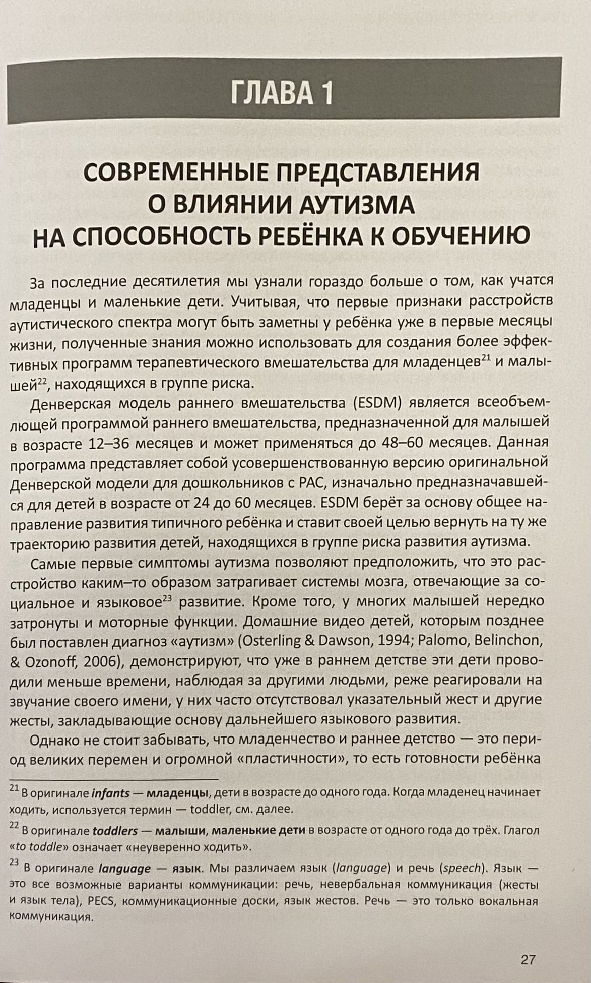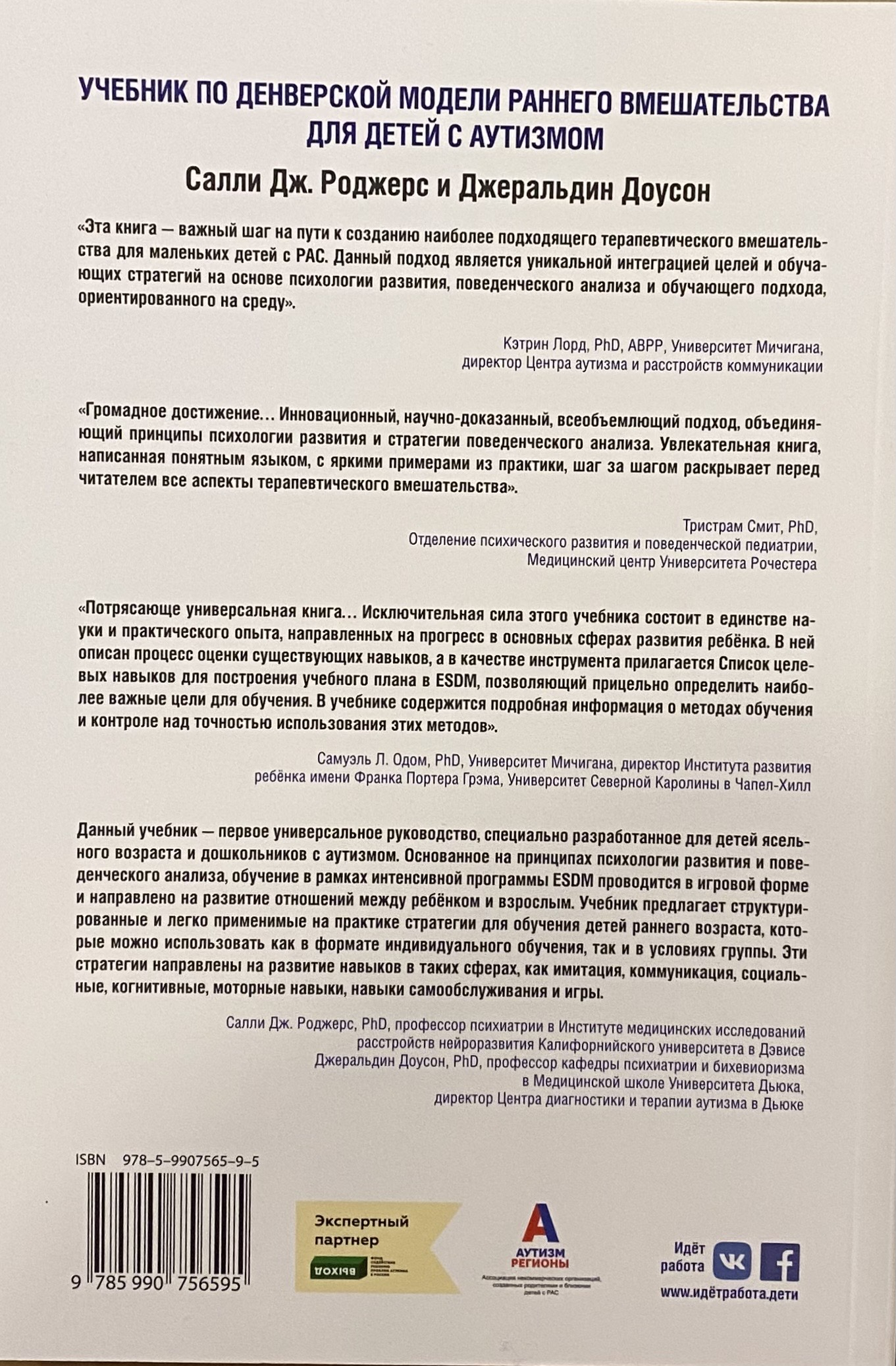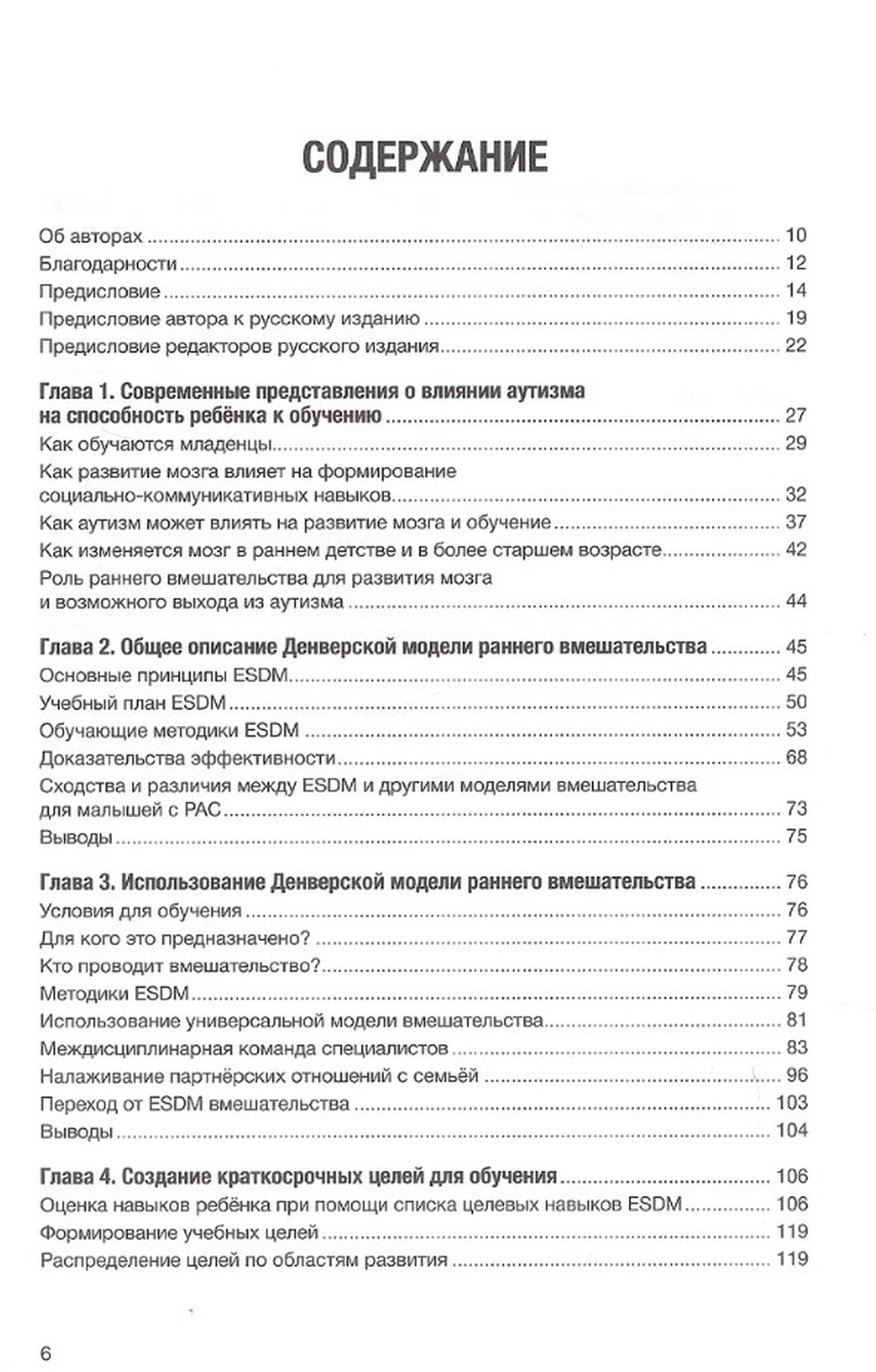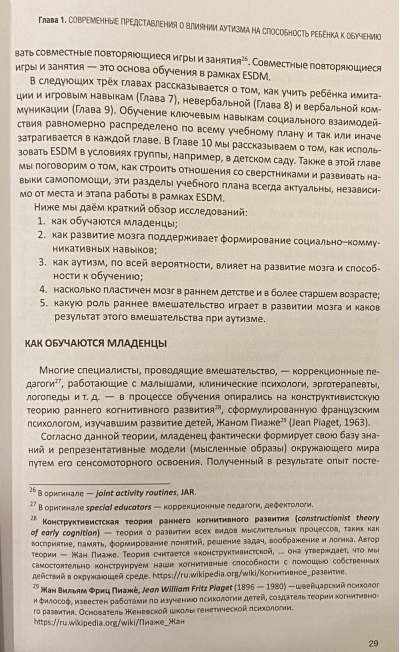 Grāmatā sniegti mūsdienu zinātniskie dati par ASD ietekmi uz smadzeņu procesiem, Denveras agrīnās iejaukšanās modeļa galvenie avoti un elementi, detalizēti aprakstīti bērna attīstības īstermiņa un ilgtermiņa mērķu rakstīšanas procesi, skaidri parādītas metodes imitācijas, rotaļas, neverbālās un verbālās komunikācijas prasmju mācīšanai, kā arī mācīšanai grupā.
