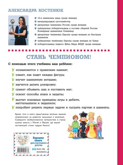 Ar šīs mācību grāmatas palīdzību jūsu bērns: - iepazīsies ar šaha noteikumiem; - uzzinās, kā katra figūra kustas; - apgūs šaha notāciju; - iemācīsies veikt gājienus; - iemācīsies veikt gājienus; - pratīs deklarēt šahu un matus; - apgūs uzbrukuma un aizsardzības paņēmienus; - apgūs spēles pamatprincipus atklāšanā, vidējā spēlē un galotnē; - mēģinās atrisināt pirmās problēmas un izspēlēt šaha partiju. Turklāt grāmatā ir iekļauti jautri uzdevumi, kuru mērķis ir attīstīt domāšanu un uzmanību. Dodieties neparastā ceļojumā uz šaha zemi kopā ar Mitju un Mašu, kur gudrais Kaiša būs jūsu mentors!