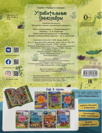 "Apbrīnojamie dinozauri" no sērijas "Atrodi un parādi" ir grāmata ar skaistām ilustrācijām un aizraujošām aktivitātēm. Katrā atvērumā ir spilgti, dzīvespriecīgi, detalizēti attēli, un bērnam ir jāatrod 10 objekti uz katra. Katrs attēls ir veidots ar atšķirīgu tematiku, tāpēc nav iespējas garlaikoties! Grāmatai ir liels, bērniem draudzīgs formāts, padarot visas ilustrācijas lielas un viegli saskatāmas. Šī grāmata, kas paredzēta vecākiem pirmsskolas vecuma bērniem, ne tikai bagātinās viņu laiku, bet arī palīdzēs attīstīt neatlaidību un uzmanību — īpašības, kas ir būtiskas katram nākamajam skolas vecuma bērnam.