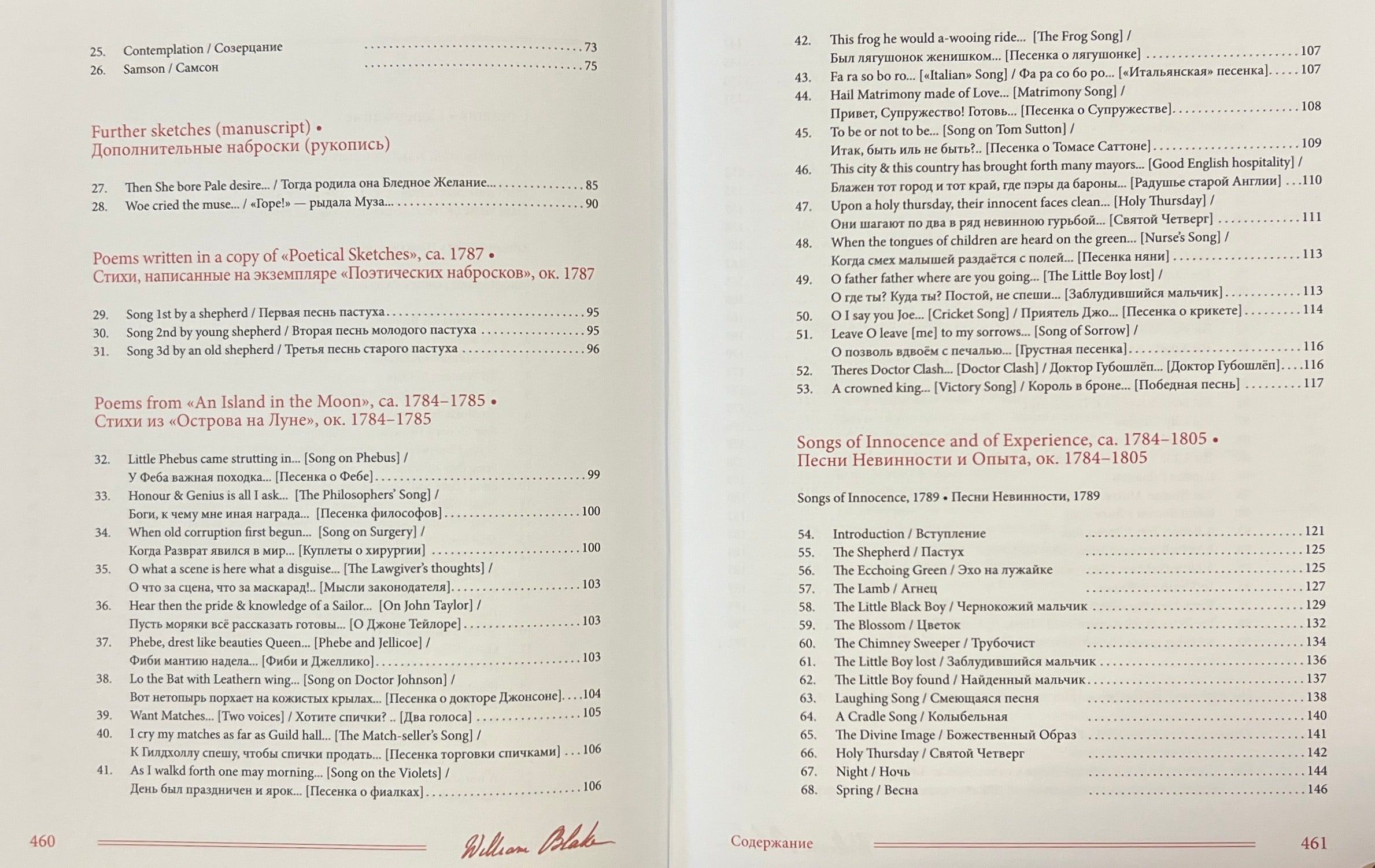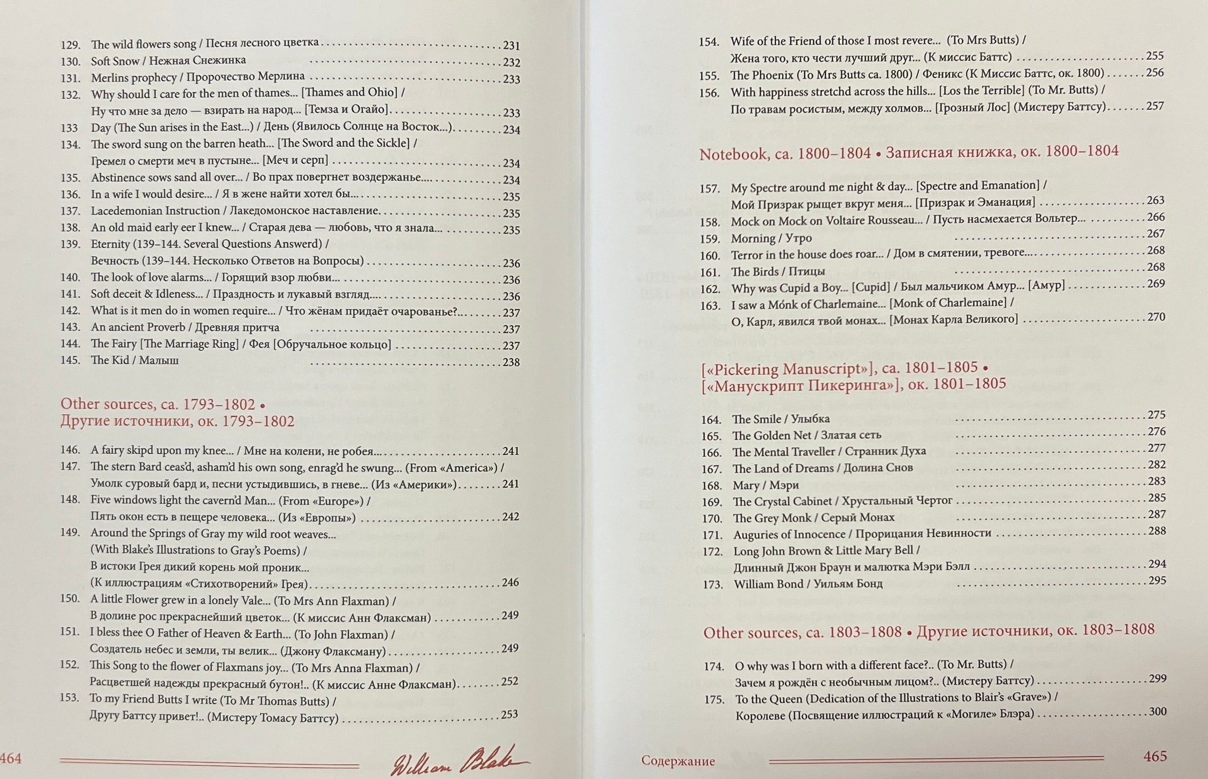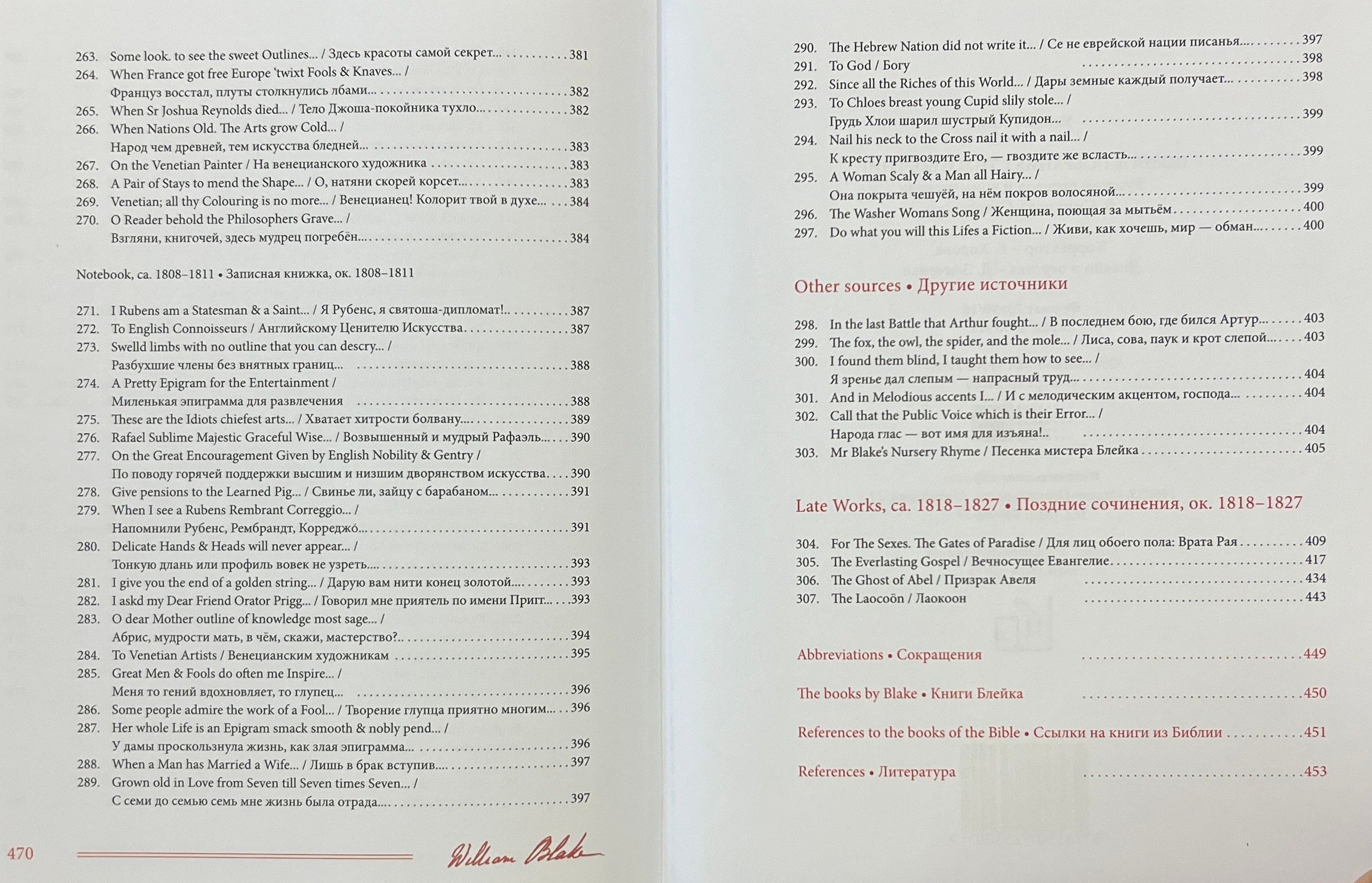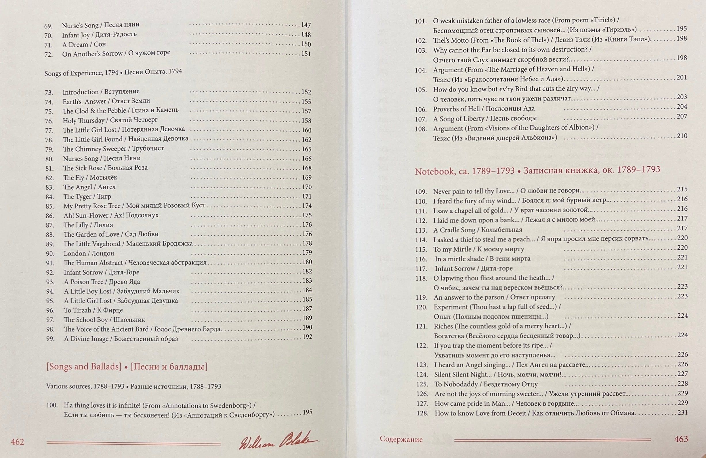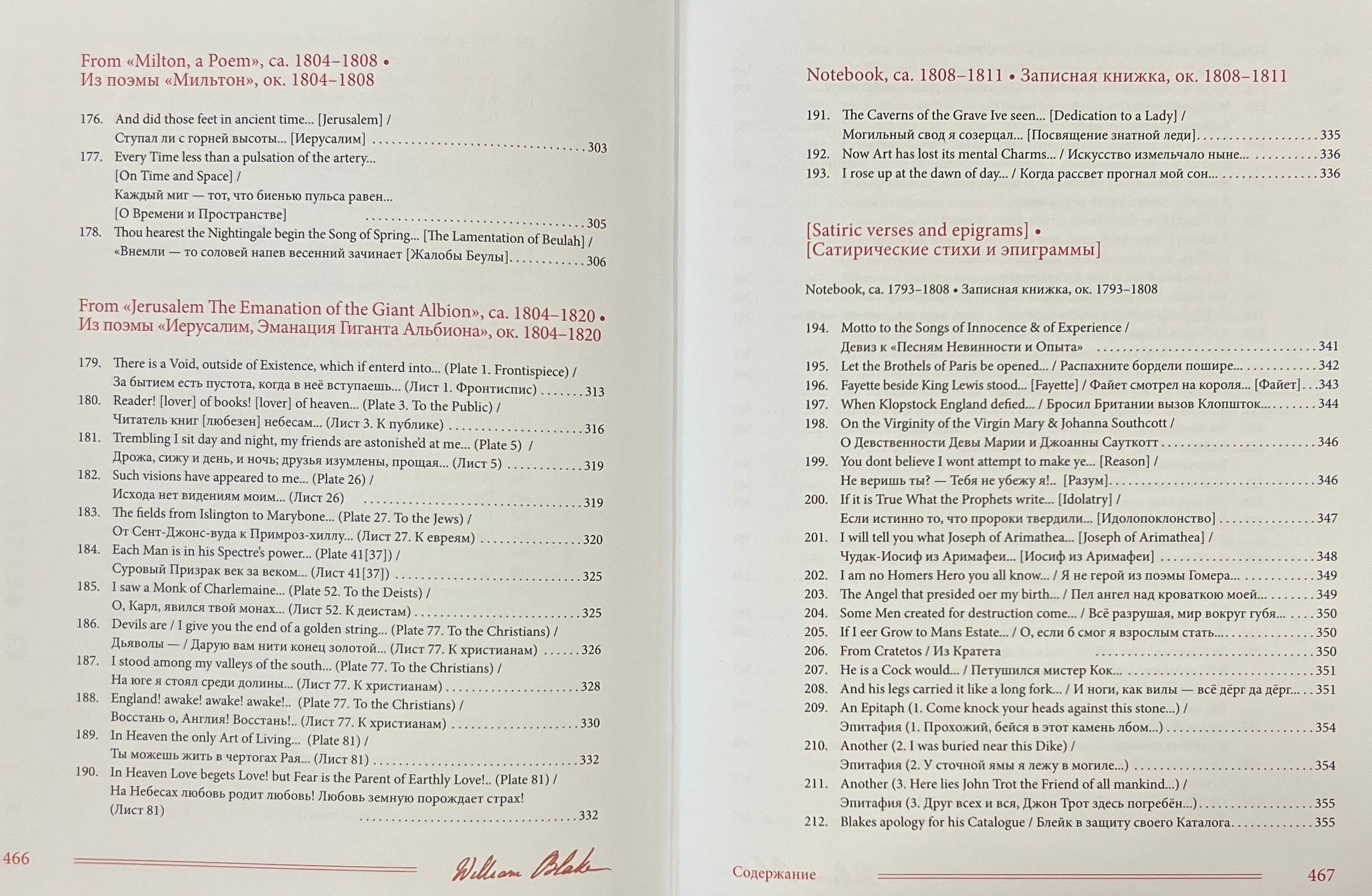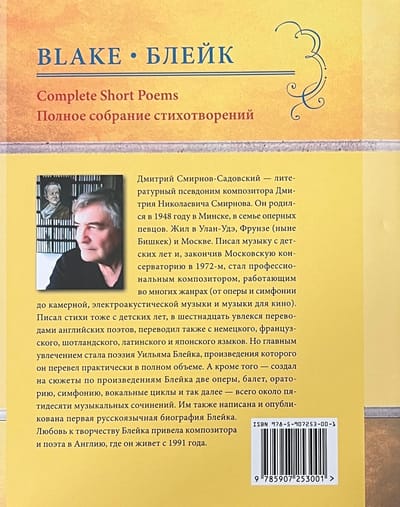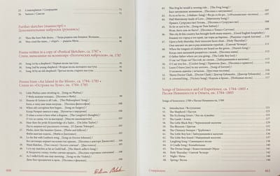 Šajā grāmatā apkopoti Viljama Bleika (1759-1827) dzejoļi D. Smirnova-Sadovska tulkojumā. Šeit pilnībā pārstāvēti visi Bleika dzejoļu krājumi - gan tie, kurus apkopojuši viņa draugi, piemēram, "Poētiskās skices", gan tie, kurus viņš pats sastādījis, izrediģējis un iespiesis, piemēram, slavenās "Nevainības un pieredzes dziesmas". Turklāt pilnībā tulkoti arī Blēka dzejoļi, kas saglabājušies melnrakstos un manuskriptos, tostarp viņa "Piezīmju grāmata", pazīstama arī kā Rossetti manuskripts, un desmit balāžu krājums Pickering Manuscript, kā arī dzejoļi no vēstulēm, dzejas epistolēm, veltījumiem, satīriskiem dzejoļiem, epigrammām, fragmentiem utt. Pilnīguma labad iekļauti arī dzejas ieslēgumi no prozas tekstiem, izlasīto grāmatu anotācijas un Bleika "pravietiskie" dzejoļi, kurus viņš nekad nav domājis publicēt. Darbu pie šo tekstu tulkojumiem krievu valodā tulkotājs uzsāka 1967. gadā un turpināja vairāk nekā pusgadsimtu. Daudzi no šiem tulkojumiem tiek publicēti pirmo reizi.