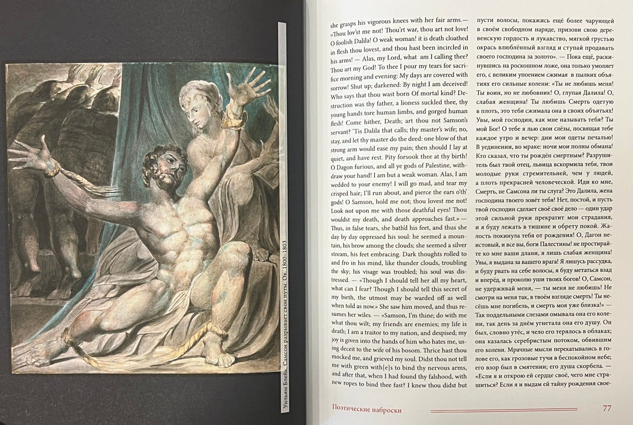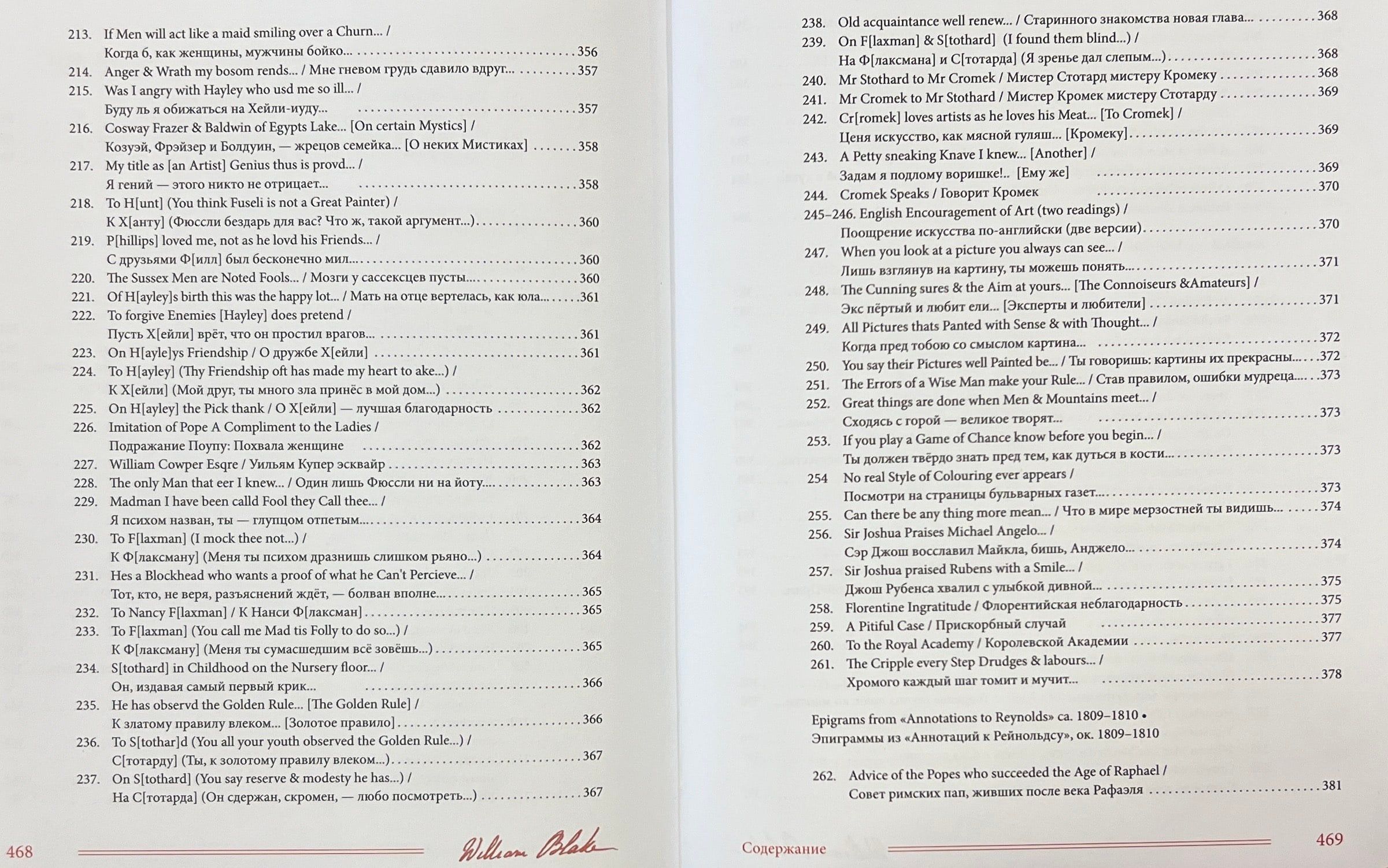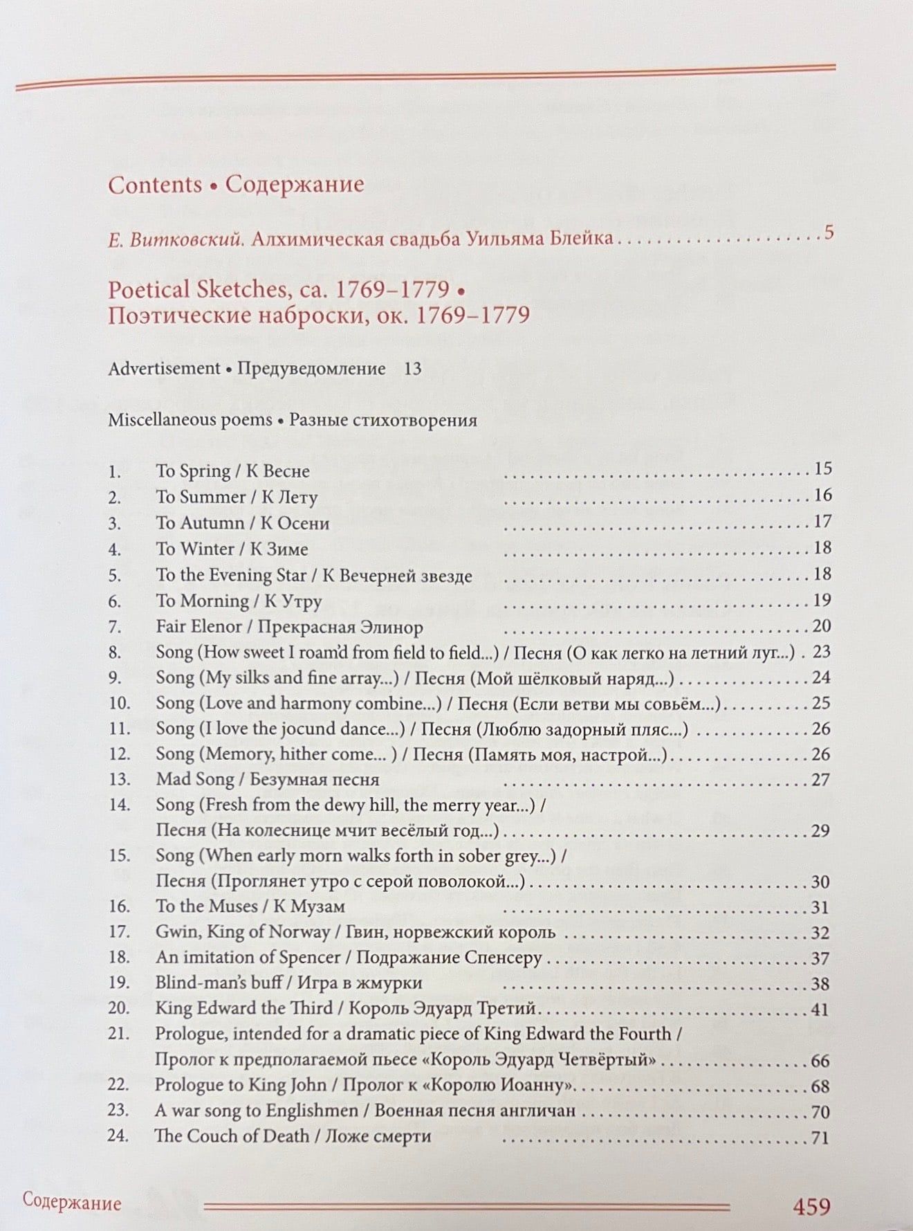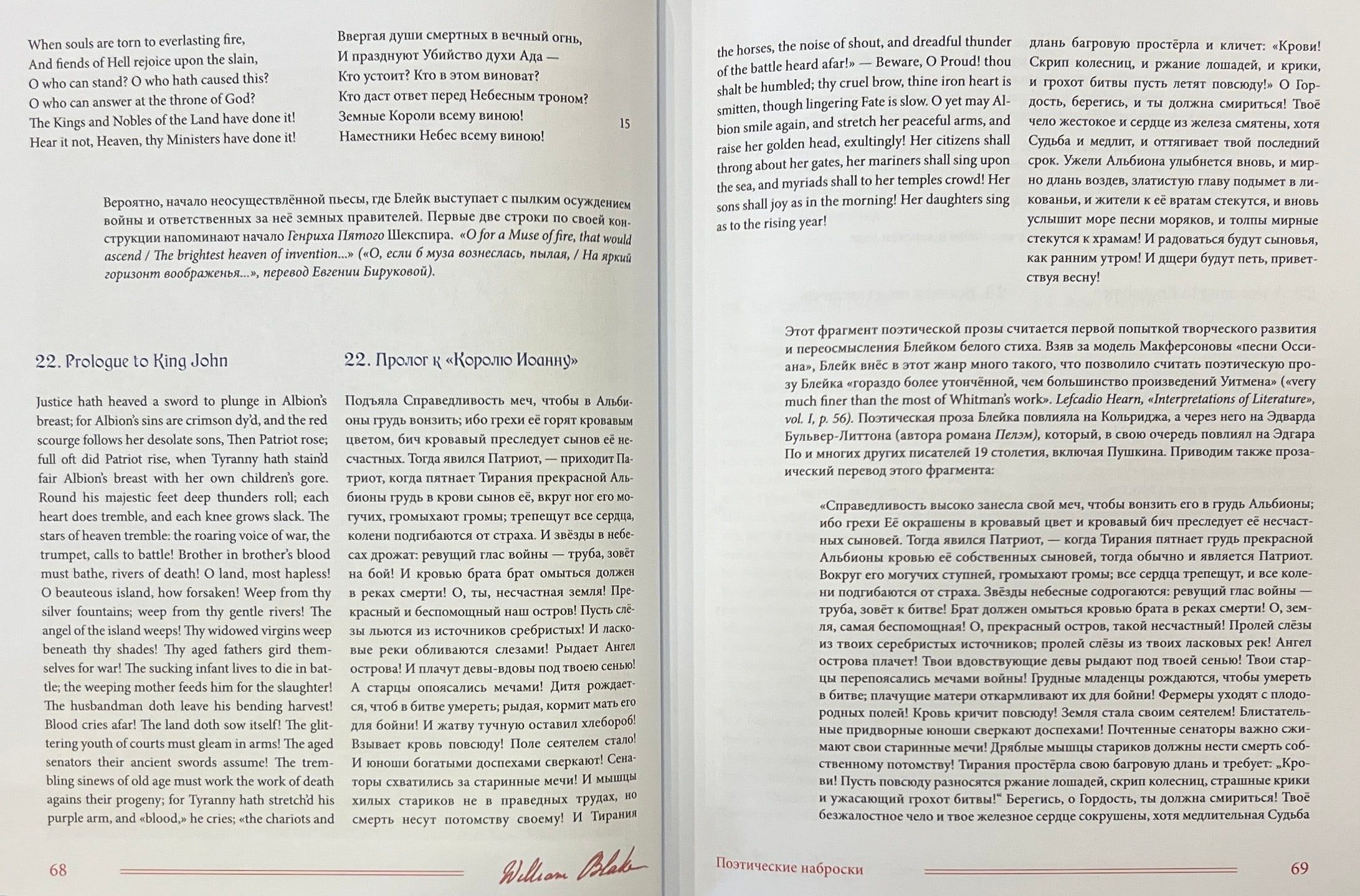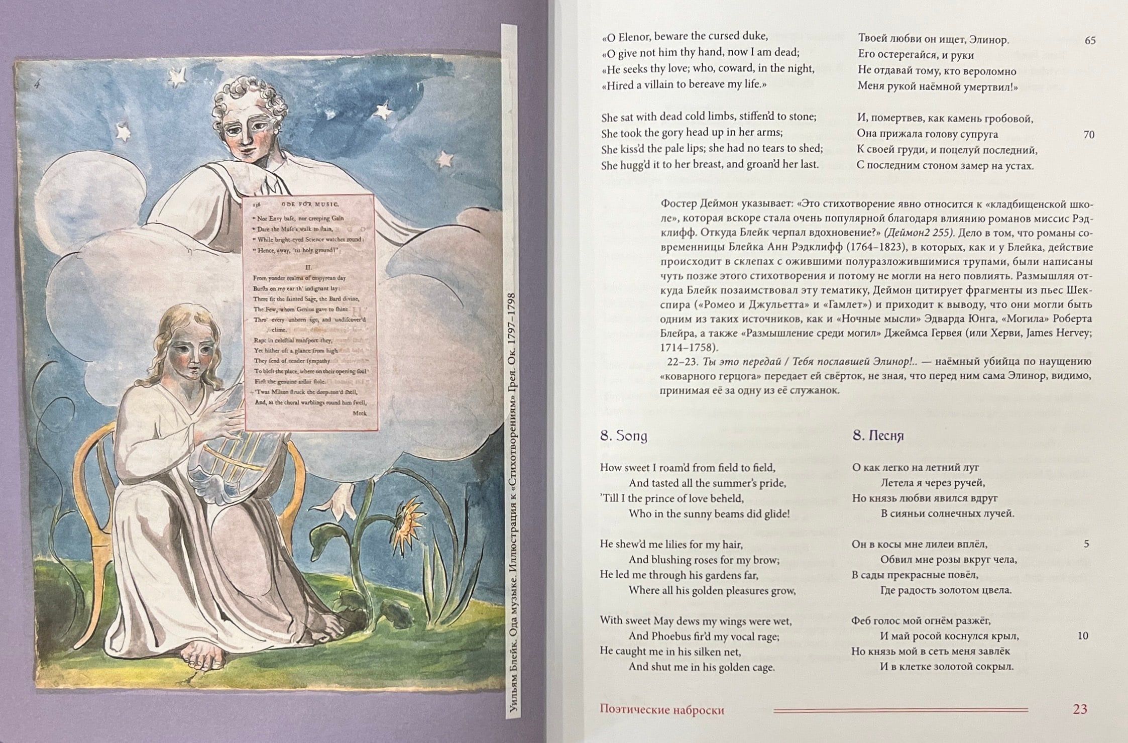 Šajā grāmatā apkopoti Viljama Bleika (1759-1827) dzejoļi D. Smirnova-Sadovska tulkojumā. Šeit pilnībā pārstāvēti visi Bleika dzejoļu krājumi - gan tie, kurus apkopojuši viņa draugi, piemēram, "Poētiskās skices", gan tie, kurus viņš pats sastādījis, izrediģējis un iespiesis, piemēram, slavenās "Nevainības un pieredzes dziesmas". Turklāt pilnībā tulkoti arī Blēka dzejoļi, kas saglabājušies melnrakstos un manuskriptos, tostarp viņa "Piezīmju grāmata", pazīstama arī kā Rossetti manuskripts, un desmit balāžu krājums Pickering Manuscript, kā arī dzejoļi no vēstulēm, dzejas epistolēm, veltījumiem, satīriskiem dzejoļiem, epigrammām, fragmentiem utt. Pilnīguma labad iekļauti arī dzejas ieslēgumi no prozas tekstiem, izlasīto grāmatu anotācijas un Bleika "pravietiskie" dzejoļi, kurus viņš nekad nav domājis publicēt. Darbu pie šo tekstu tulkojumiem krievu valodā tulkotājs uzsāka 1967. gadā un turpināja vairāk nekā pusgadsimtu. Daudzi no šiem tulkojumiem tiek publicēti pirmo reizi.