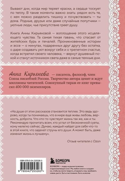 Annas Kirjanovas grāmata iemieso šo dziedinošo sajūtu, to kluso patvērumu, kas paglābj no dzīves vētrām un bēdām. Sirsnīgi stāsti un esejas — par mirkļiem, kas tiek dāvāti viens otram bez iebildumiem, par dāvanu radīt komfortu sev apkārt un aizraujošo laimi atrast īsto cilvēku — atjaunos sirdsmieru un kļūs par gaismas avotu pat visdrūmākajās dienās.