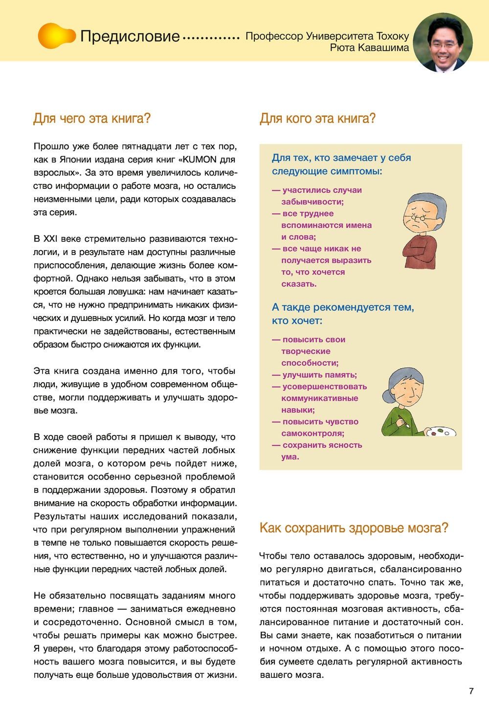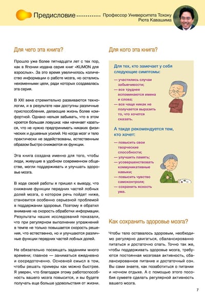 Vai jūtat, ka jūsu atmiņa ir sākusi pavājināties? Nevarat atcerēties kāda vārdu vai pareizo vārdu? Vai jums ir grūtāk veikt vienkāršus aprēķinus prātā nekā pirms desmit gadiem? Neuztraucieties: smadzeņu darbība, tāpat kā ķermeņa darbība, pēc trīsdesmit gadu vecuma pakāpeniski samazinās. Taču, ja fiziskās aktivitātes palīdz uzturēt ķermeņa tonusu, ko mūsdienu zinātne var piedāvāt smadzeņu veselībai? Ryuta Kawashima ir atradis efektīvus veidus, kā trenēt smadzenes, kas uzlabos to darbību. Lai to izdarītu, jums tikai jāatrisina vienkārši matemātikas piemēri.