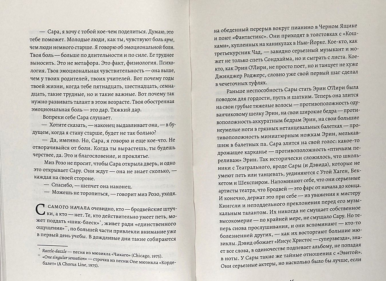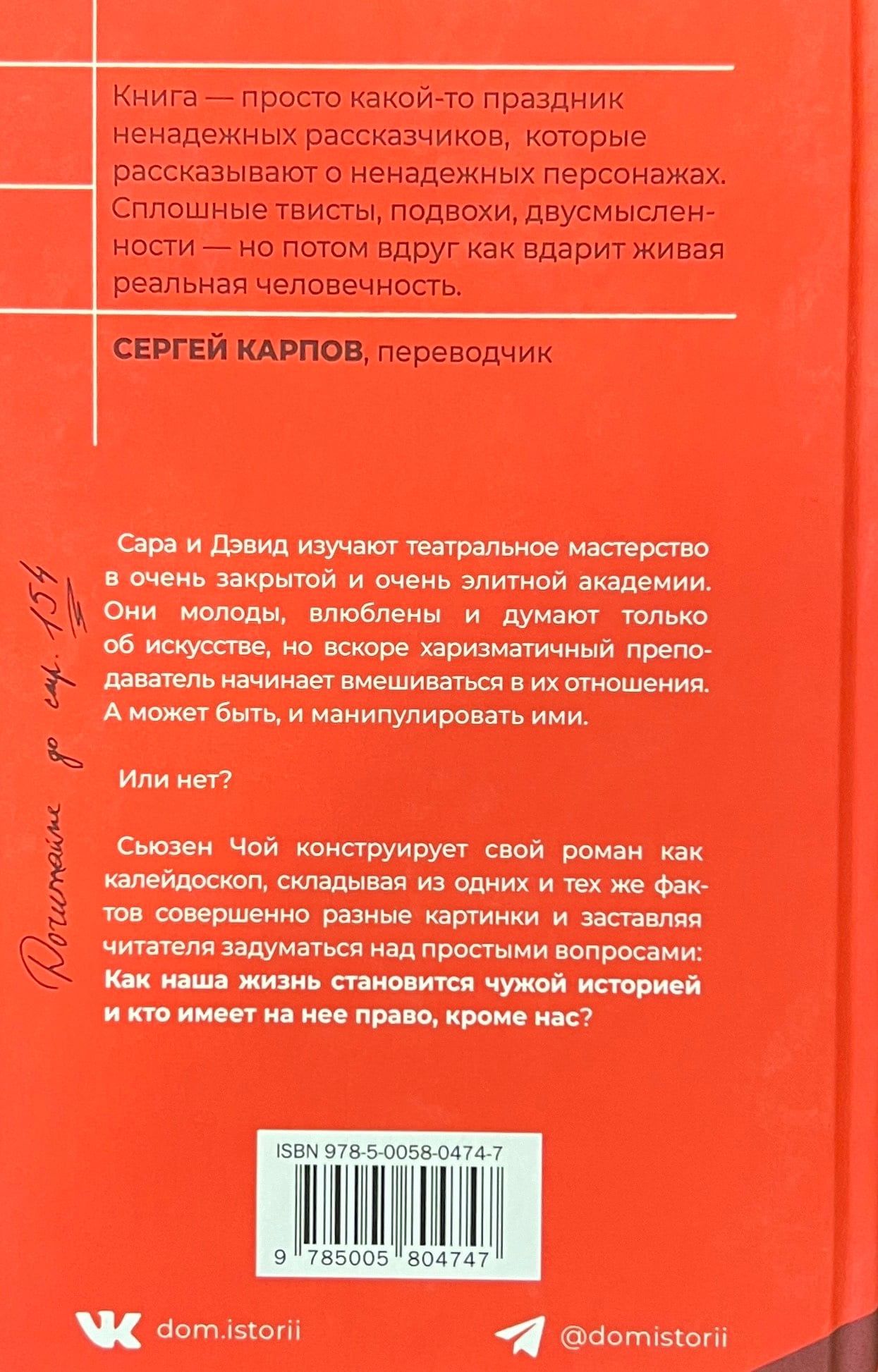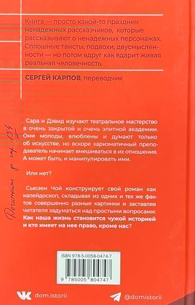 Sāra un Deivids studē teātri ļoti privātā un ļoti elites akadēmijā. Viņi ir jauni, iemīlējušies un domā tikai par mākslu, bet drīz vien harizmātiskais skolotājs sāk iejaukties viņu attiecībās. Vai varbūt pat manipulēt ar viņiem. Vai arī nē? Susan Choi savu romānu veido kā kaleidoskopu, saliekot kopā pilnīgi dažādas bildes no vieniem un tiem pašiem faktiem un liekot lasītājam domāt par vienkāršiem jautājumiem: kā mūsu dzīve kļūst par kāda cita stāstu un kam ir tiesības uz to, bet mums?