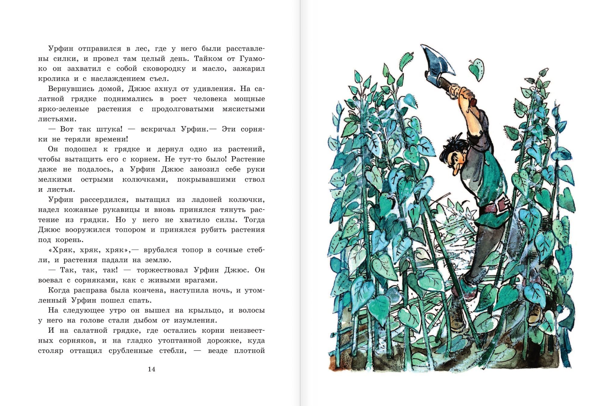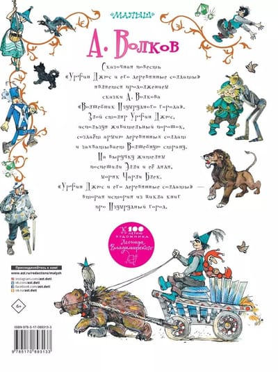 A. M. Volkova pasakainais stāsts "Urfins Jus un viņa koka kareivji" turpina stāstu par meitenes Ellijas un viņas draugu piedzīvojumiem Burvju zemē. Šoreiz ļaunais galdnieks Urfins Jus, izmantojot dzīvību dodošo pulveri, izveido koka karavīru armiju un ieņem Burvju zemi. Ellija un viņas tēvocis, jūrnieks Čārlijs Melnais, steidzas palīgā iedzīvotājiem. Grāmatas māksliniekam Leonīdam Vladimirskim 2020. gadā apritēs 100 gadi. Grāmatas autors Aleksandrs Volkovs viņa ilustrācijas uzskata par labākajām. Vidusskolas vecumam.