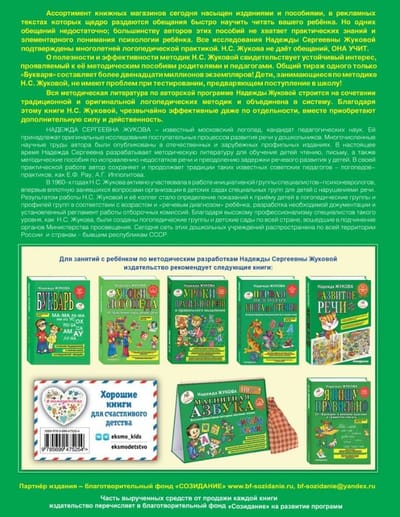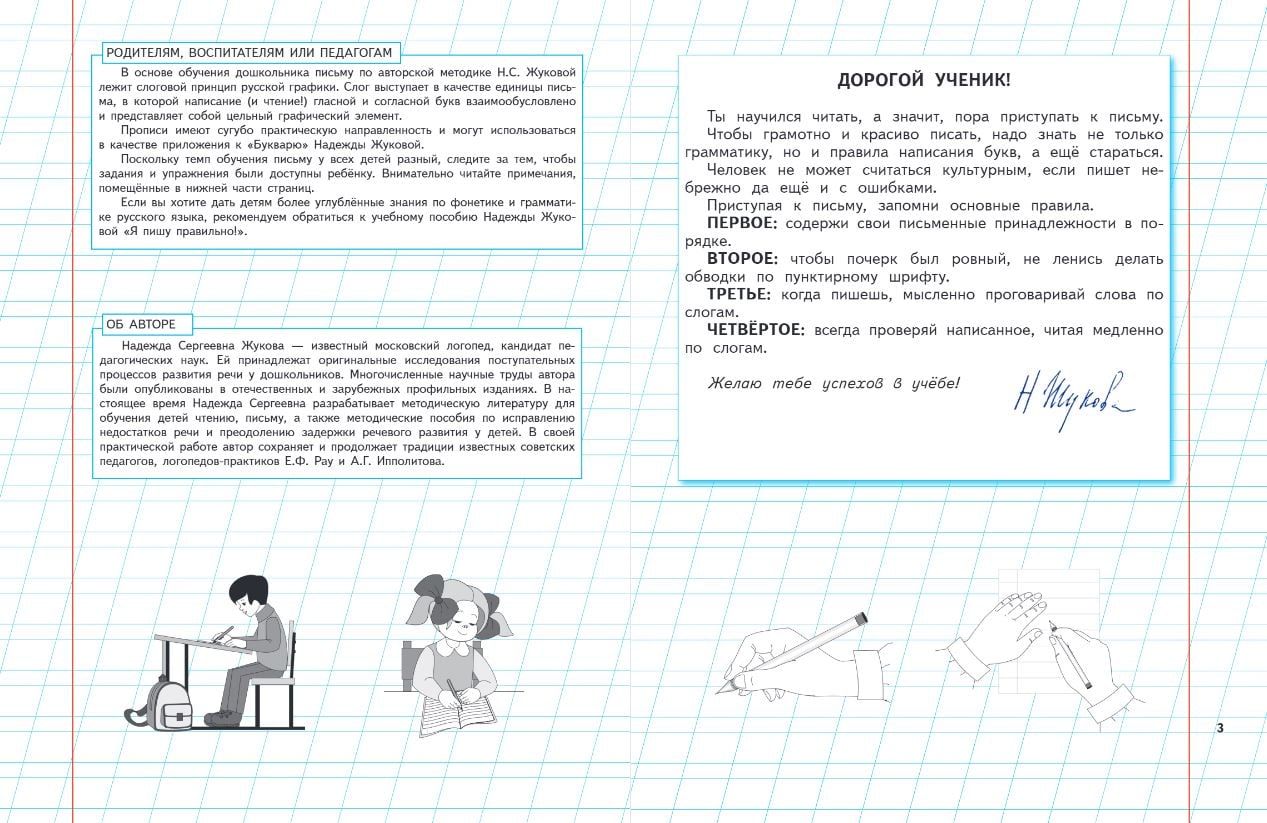 Pareizai lasīšanai un rakstīšanai, kā arī runas kļūdu labošanai bērniem nepieciešama tikai pārbaudīta un progresīva metode, kas balstīta daudzu gadu pieredzē. Grāmata palīdz veidot bērna nākotnes rokrakstu, kā arī attīsta topošo skolēnu neatlaidību un pacietību. Izglītojošās burtnīcas ir drukātas uz balta papīra: lapas izskatās kā lielformāta līnijota piezīmju grāmatiņa ar sarkanām malām un mazām melnbaltām ilustrācijām. Liela uzmanība tiek pievērsta krievu valodas pamatnoteikumu apguvei. Šīs burtnīcas ir paredzētas kaligrāfiskā rokraksta, pareizrakstības un pieturzīmju prasmju veidošanai. Par metodes autori: Nadežda Sergeevna Žukova ir pazīstama logopēde, pedagoģijas zinātņu kandidāte un klasiskās pedagoģijas piekritēja. Savās grāmatās viņa izmantoja gan slavenu logopēdu pētījumus, gan savas oriģinālās, laika gaitā pārbaudītās metodes. Ar plašu praktisko pieredzi darbā ar īpašiem, "grūtiem" bērniem Nadežda Sergeevna izveidoja metodi, kas ir pieejama ikvienam, attālinoties no "zinātniskā" un "abstraktā". Ikviens, kurš jebkad ir strādājis ar bērnu, izmantojot Nadeždas Žukovas rokasgrāmatas, atzīmē materiāla prezentācijas vienkāršību, bērnu vieglumu to apgūt. Ja vēlaties turpināt nodarbības ar savu bērnu, izmantojot N.S. Žukovas autorprogrammu, izdevniecība EKSMO iesaka pievērst uzmanību šādām grāmatām: - "ABC", - "Pirmā lasīšanas grāmata pēc ABC", - "Rakstprasmes un lasītprasmes stundas", - "Es runāju pareizi", - "Es rakstu pareizi", - "Logopēda stundas".