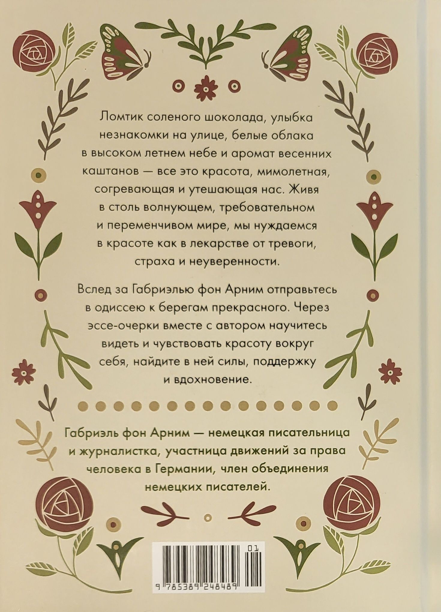 Šajā eseju krājumā vācu rakstniece un žurnāliste Gabriele fon Arnima pēta skaistuma fenomena daudzšķautņainību. Iegremdējieties autores pasaulē, kas veidota no sapņiem, dienas sapņiem un atmiņām. Atrodiet siltumu un atbalstu jūtīgajos un maigajos vārdos, kas veido katru stāstu, un kopā ar mazo meitenīti vārdā Gabriele iemācieties saskatīt skaistumu sev apkārt un gūt no tā mierinājumu pat vissatraucošākajos laikos.