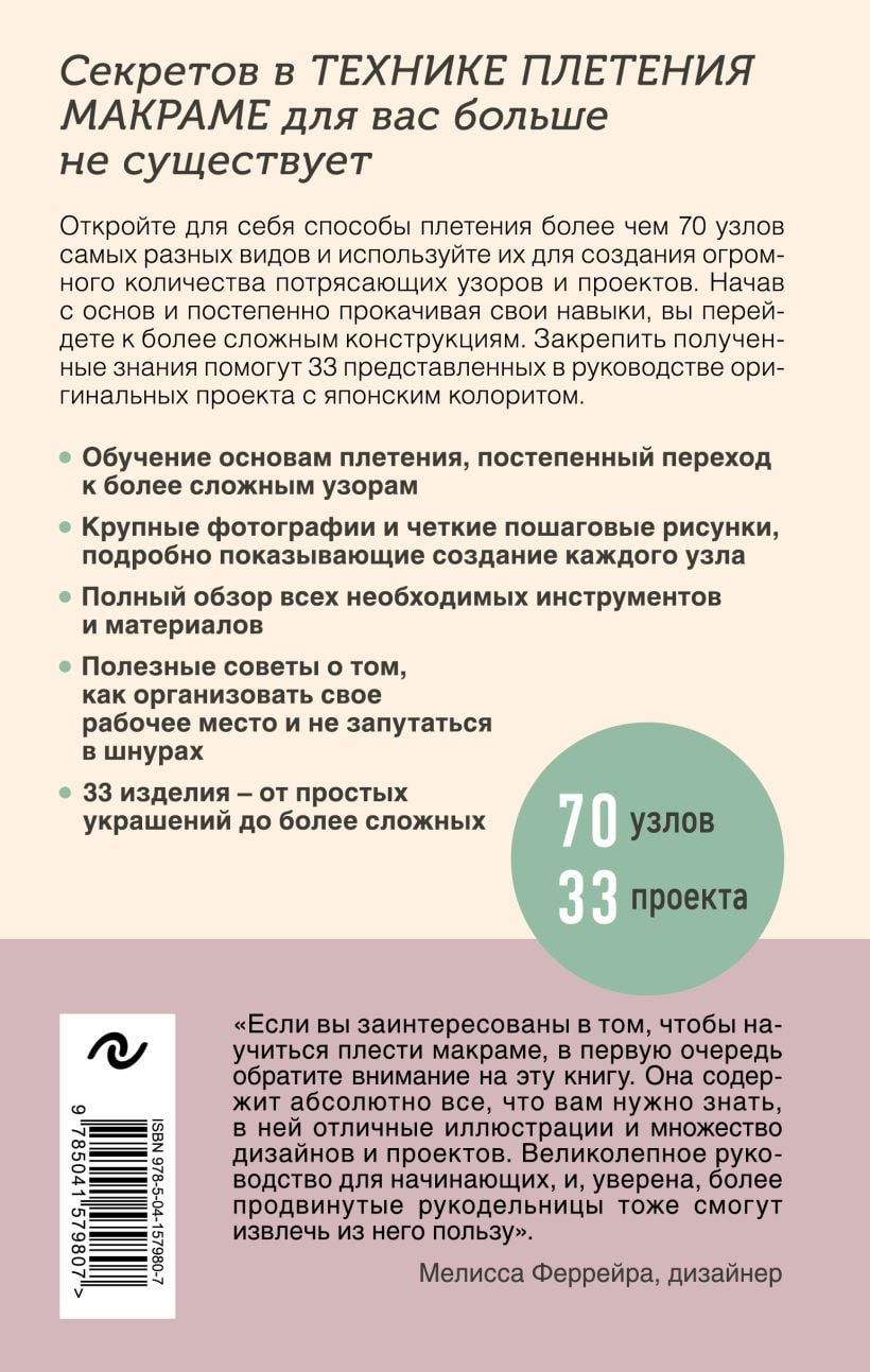 Šī grāmata jūs iepazīstinās ar radošu iespēju pasauli un iedvesmos atkārtot jau redzētas idejas vai radīt savas. 1. nodaļā sniegta visa nepieciešamā informācija, lai sāktu darbu ar materiāliem un pamata instrumentiem. Tajā aplūkoti diegi, noderīgi ieteikumi un veidi, kā plānot, sākt un pabeigt savu projektu. 2. nodaļa ir jūsu ceļvedis mezglos un rakstos. Atklājiet tehnikas, kā izveidot vairāk nekā 70 makramē mezglus, un pēc tam izmantojiet tās, lai radītu milzīgu satriecošu projektu klāstu. 3. nodaļā parādīti pabeigtu projektu piemēri un padomi par pareizā auklas veida un krāsu izvēli.