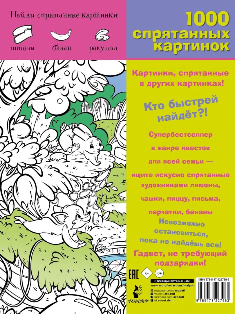Pasaulē visvairāk pārdoto izklaidējošo grāmatu visai ģimenei sērija 1000 Slēptās bildes ir īpaši radīta jautriem un uzmanīgiem bērniem un viņu pieaugušajiem. Ar šīs sērijas grāmatām jūs sagaida stundām ilgas ģimenes izklaides stundas - sarīkojiet sacensības "Kurš to atradīs pirmais", lai noskaidrotu, kurš to atradīs ātrāk! Sākumā tas būs viegli - pirmajās lappusēs ir ļoti maz atrodamo bilžu, taču, jo tālāk mežā, jo sīvāka slēptuve! Katrā lapā ir no 10 līdz 40 paslēptiem attēliem. Un, kad atradīsi visus priekšmetus, grāmata pārvērtīsies par lielu krāsojamo grāmatu!