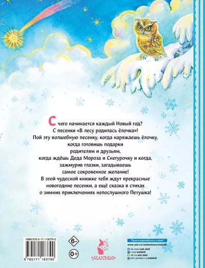 Kā sākas katrs Jaungada vakars? Ar dziesmu "Mežā piedzima eglīte". Dziediet šo maģisko dziesmu, kad rotājat eglīti, kad gatavojat dāvanas vecākiem un draugiem, kad gaidāt Sniega vecīti un Sniegavīru un kad aizverat acis un izsakāt savu dziļāko vēlēšanos! Šajā brīnumainajā grāmatā atradīsi arī Jaungada dziesmas un pasaku dzejolī par nešpetnā gailenīša ziemas piedzīvojumiem!