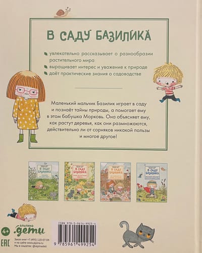 Sērija Bazilikas dārzs ir izglītojoša grāmata pašiem mazākajiem par apbrīnojamo augu pasauli. Vecmāmiņa Burkāns atradīs atbildes uz dažādiem mazdēla Bazilika jautājumiem: vai augi var mīlēt, kā viņiem rodas bērni, kādas viņiem piemīt spējas un ko viņi var darīt?