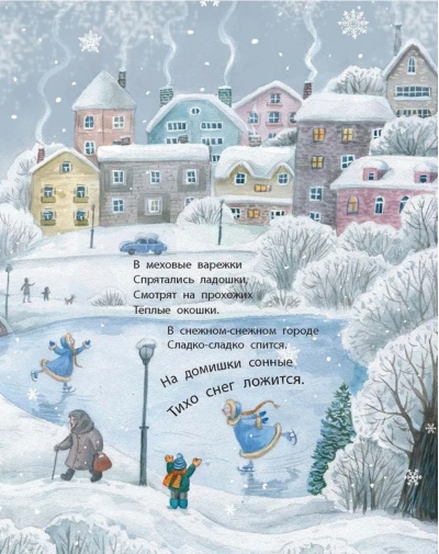 Svetlanas Samovičevas grāmata "Sniegotā, sniegotā pilsētā..." satur dzejoļus, kas aptver visu ziemas dienu burvību — no skanīgiem smiekliem uz apledojušiem slidkalniņiem līdz klusajiem salnajiem vakariem. Aizkustinoši dzejoļi par ziemu piepilda grāmatu ar siltumu un prieku, un Ļubovas Jereminas-Nošinas maigā ilustrācija padara to dzīvespriecīgu un mājīgu.