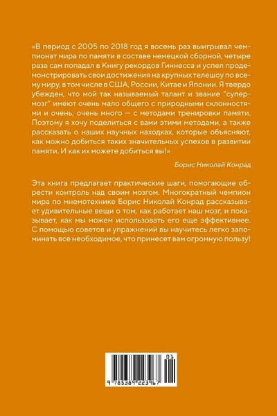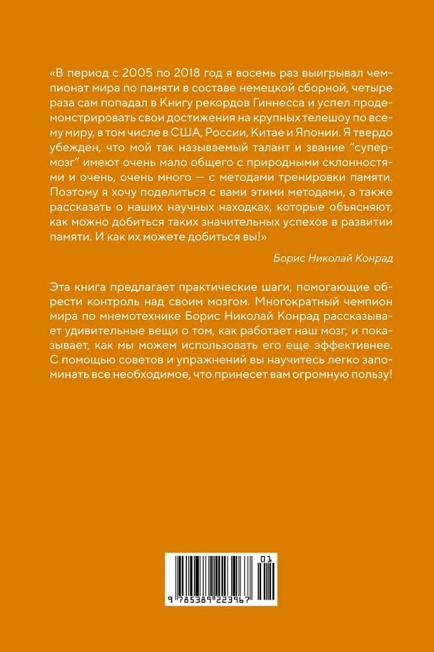 Slavenā atmiņas darba eksperta, pasaules čempiona mnemonikā Borisa Nikolaja Konrāda grāmata apkopo viņa pieredzi, kas uzkrāta gandrīz 20 gadu laikā iegaumēšanas apmācībā, un satur vienkāršus un efektīvus ieteikumus.