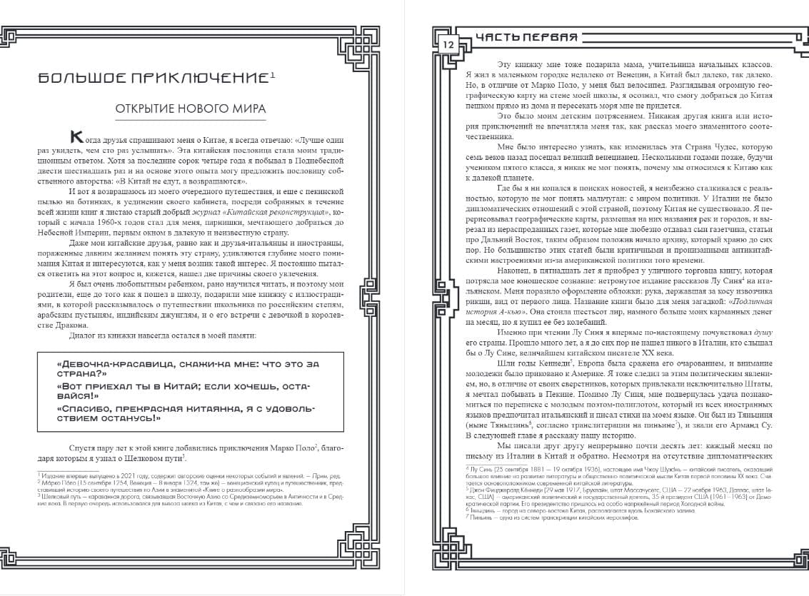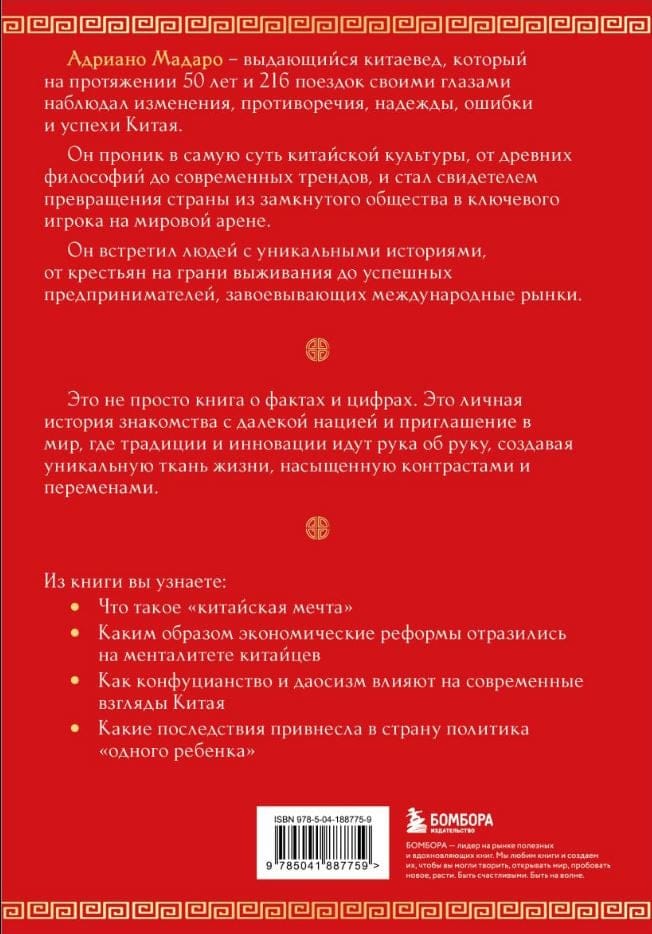 Pateicoties šai grāmatai, mums ir unikāla iespēja redzēt Ķīnu caur Madaro Adriano acīm, caur viņa piezīmēm no 1979. gada ceļojuma, kas kļuva par “savveida robežu starp pagātnes Ķīnu un nākotni”. Autors dalās savos iespaidos no trokšņainām megapilsētām līdz klusiem ciematiem, no seniem tempļiem līdz mūsdienu debesskrāpjiem. Grāmatas lappusēs jūs sajutīsiet, kā Pekinas, Šanhajas un Guandžou pilsētu centri atdzīvojas, un atklāsiet, kas padara katru no šīm pilsētām īpašu. Šī grāmata palīdzēs jums paskatīties uz Ķīnu no dažādiem skatupunktiem, saprast, kāpēc tā kļuva tieši par to, ko mēs to pazīstam šodien, un uzzināt, kādi izaicinājumi un pārmaiņas sagaida šo apbrīnojamo valsti cīņā par pasaules kundzību.
