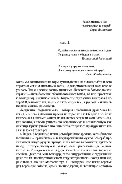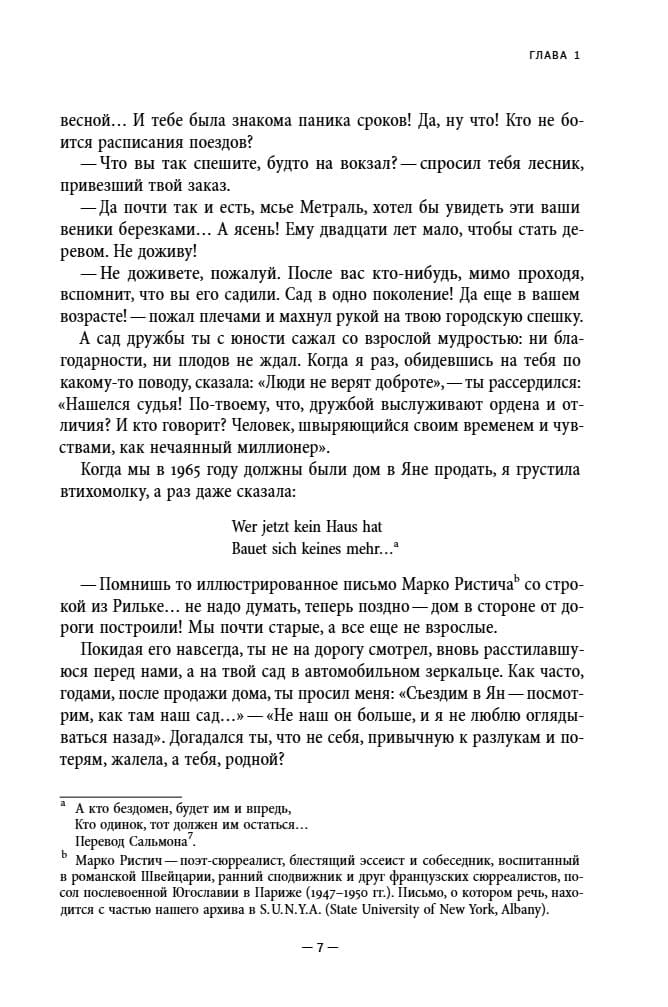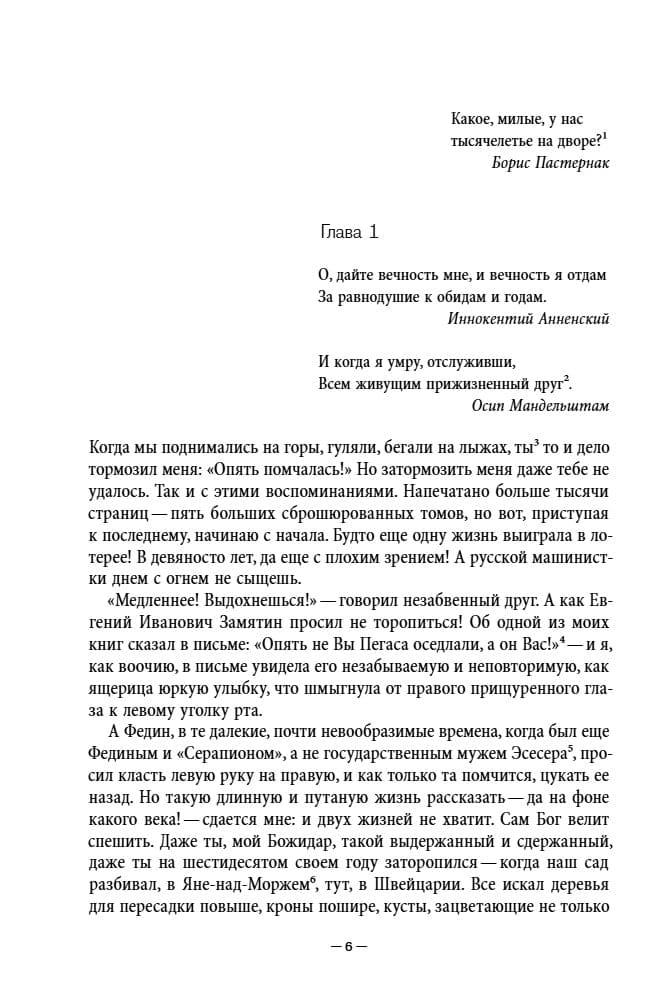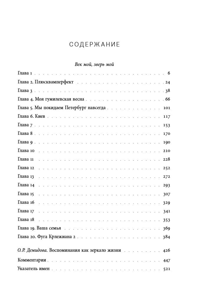 Memuāros, kas balansē starp memuāriem un daiļliteratūru, romāniste, dzejniece un tulkotāja Irina Jefimovna Kunina (1900–2003) apkopo savu neparasto dzīvi. 20. gs. 10. gados viņa studēja Augstākajos sieviešu Raevska kursos, pievienojās Sanktpēterburgas literārajām aprindām un uzturēja kontaktus ar Aleksandru Bloku, Nikolaju Gumilevu un Osipu Mandelštamu. Pēc tam sekoja pārcelšanās uz Kijevu, kur viņa satika vietējos un viesojošo literātus, bēgšana uz Odesu, dalība Baltās armijas Bredovas kampaņā, laulības ar Baltās gvardes pulkvedi, nokļūšana Polijas Baltās armijas vienību internēšanas nometnē, bēgšana no tās, Konstantinopolē un visbeidzot Zagrebā, kur viņa izšķīrās ar savu vīru. 1924. gadā viņa atgriezās Krievijā, kur rakstīja laikrakstu recenzijas, dziesmu tekstus un scenārijus, filmējās vairākās filmās un sadraudzējās ar Mihailu Zoščenko. Tomēr pēc ārzemju ceļojuma 1926. gadā Kunina neatgriezās un apprecējās ar horvātu juristu Bozidaru Aleksandru, kurš vēlāk kļuva par ievērojamu Dienvidslāvijas diplomātu. Viņa nodzīvoja kopā ar viņu pusgadsimtu. Šajā periodā viņa uzturēja kontaktus ar daudziem diplomātiem un rakstniekiem, tostarp Jevgēņiju Zamjatinu un Sergeju Cveigu. Kuninas memuāri ir reta liecība par cilvēku, kurš pārdzīvoja visas 20. gadsimta kataklizmas (trīs Krievijas revolūcijas, Pirmo pasaules karu, Pilsoņu karu un Otro pasaules karu) un spēja pielāgoties plašam kultūras tradīciju klāstam.
