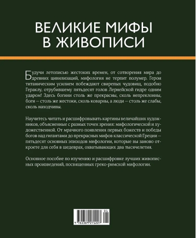 Rūpīgi izpētot "Lielos mītus glezniecībā", jūs varat viegli izprast grieķu-romiešu mitoloģiju un iemācīties lasīt un atšifrēt izcilāko mākslinieku gleznas. Autors detalizēti aplūko piecdesmit stāstus, sākot no pirmo dievību parādīšanās līdz pat Sapfo mītam, un ilustrē tos ar mākslas darbiem, kas aptver gandrīz divus tūkstošus gadu!