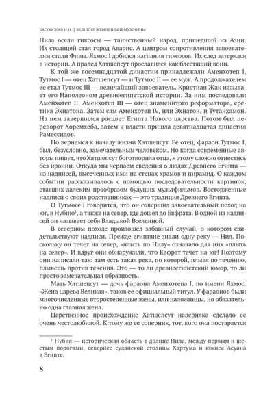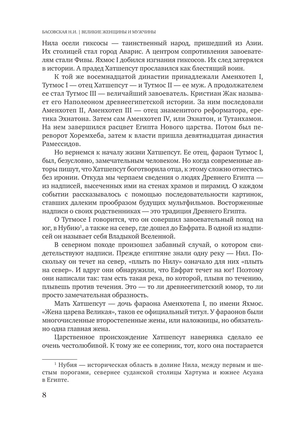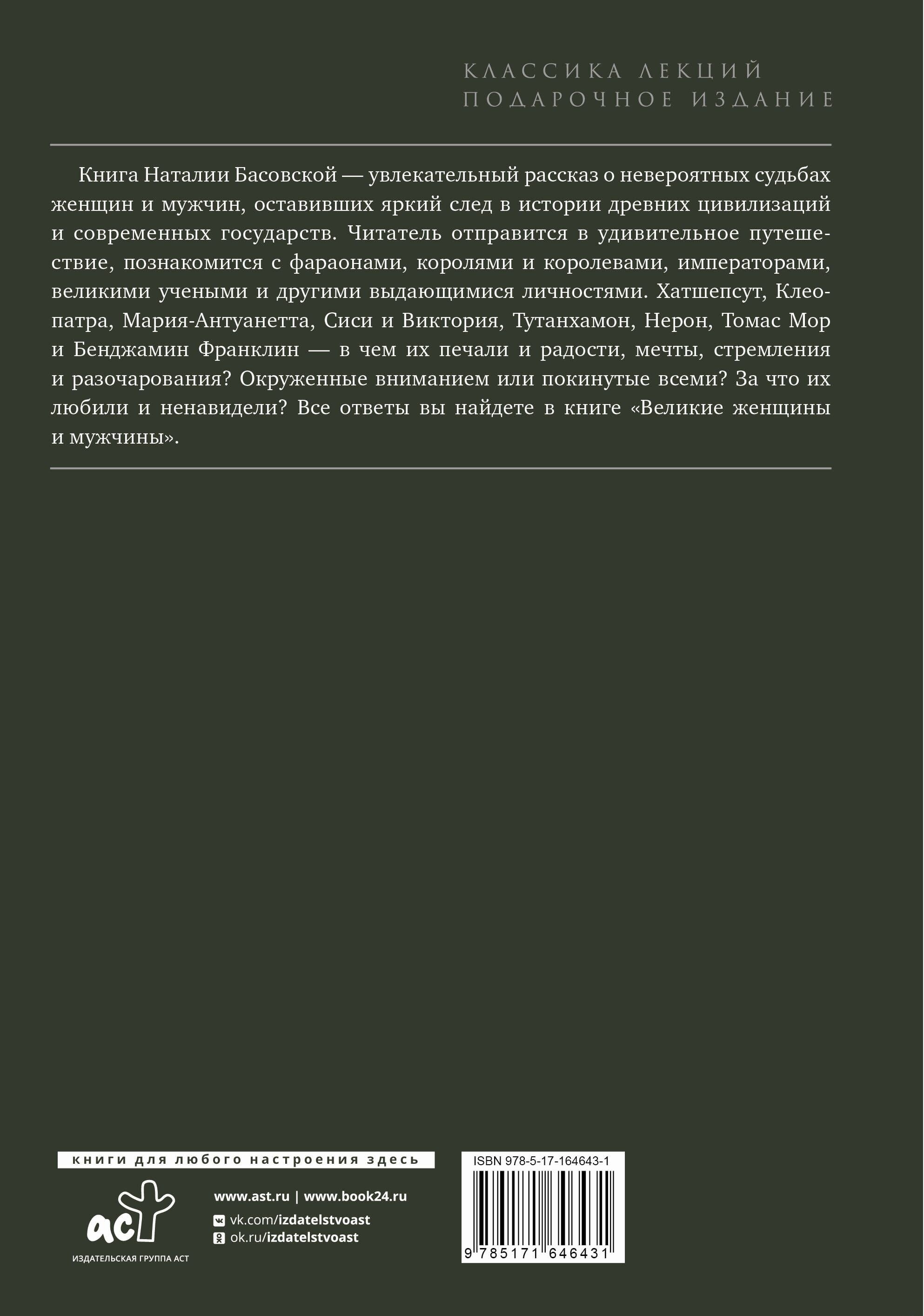 Natālijas Basovskas grāmata ir aizraujošs stāsts par sieviešu un vīriešu neticamajiem likteņiem, kas atstāja spilgtas pēdas seno civilizāciju un mūsdienu valstu vēsturē. Lasītājs dosies pārsteidzošā ceļojumā, satiks faraonus, karaļus un karalienes, imperatorus, izcilus zinātniekus un citas izcilas personības. Hatšepsuta, Kleopatra, Marija Antuanete, Sisi un Viktorija, Tutanhamons, Nerons, Tomass Mors un Bendžamins Franklins – kādas bija viņu bēdas un prieki, sapņi, centieni un vilšanās? Uzmanības ieskauts vai visu pamests? Kāpēc viņus mīlēja un ienīda? Visas atbildes atradīsi grāmatā “Lielās sievietes un vīrieši”.