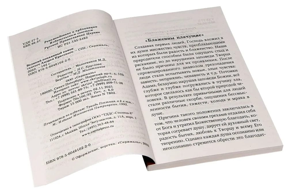 Grāmatā iekļauti liturģiskie teksti, kas nepieciešami pareizticīgajam kristietim Lielā gavēņa laikā: Svētā Andreja no Krētas Lielais gandarīšanas kanons, kas tiek lasīts pirmajās četrās gavēņa dienās; tad viss kanona teksts, kas tiek lasīts gavēņa piektās nedēļas ceturtdienā dievkalpojumā ar nosaukumu «Ēģiptes Marijas stāvēšana»