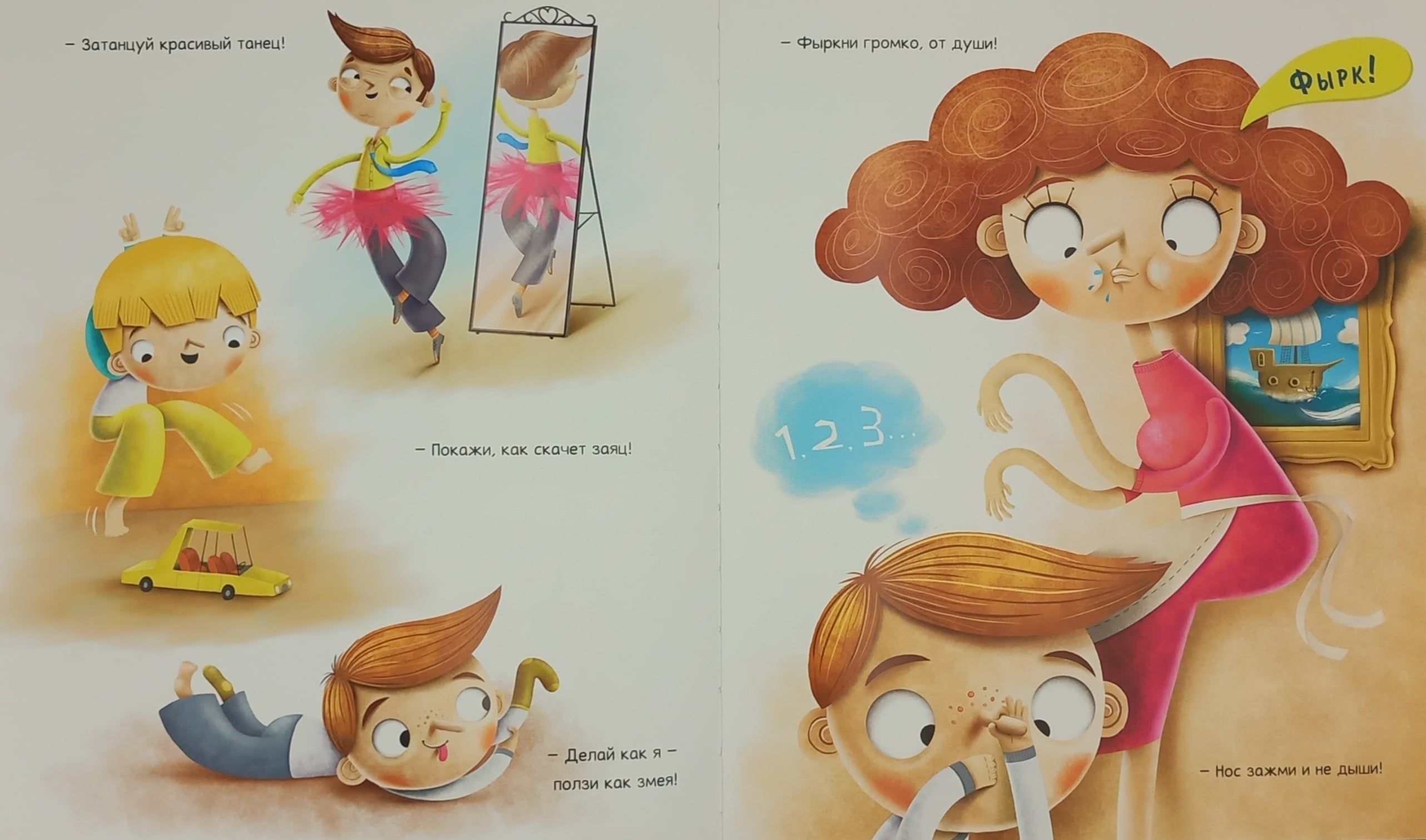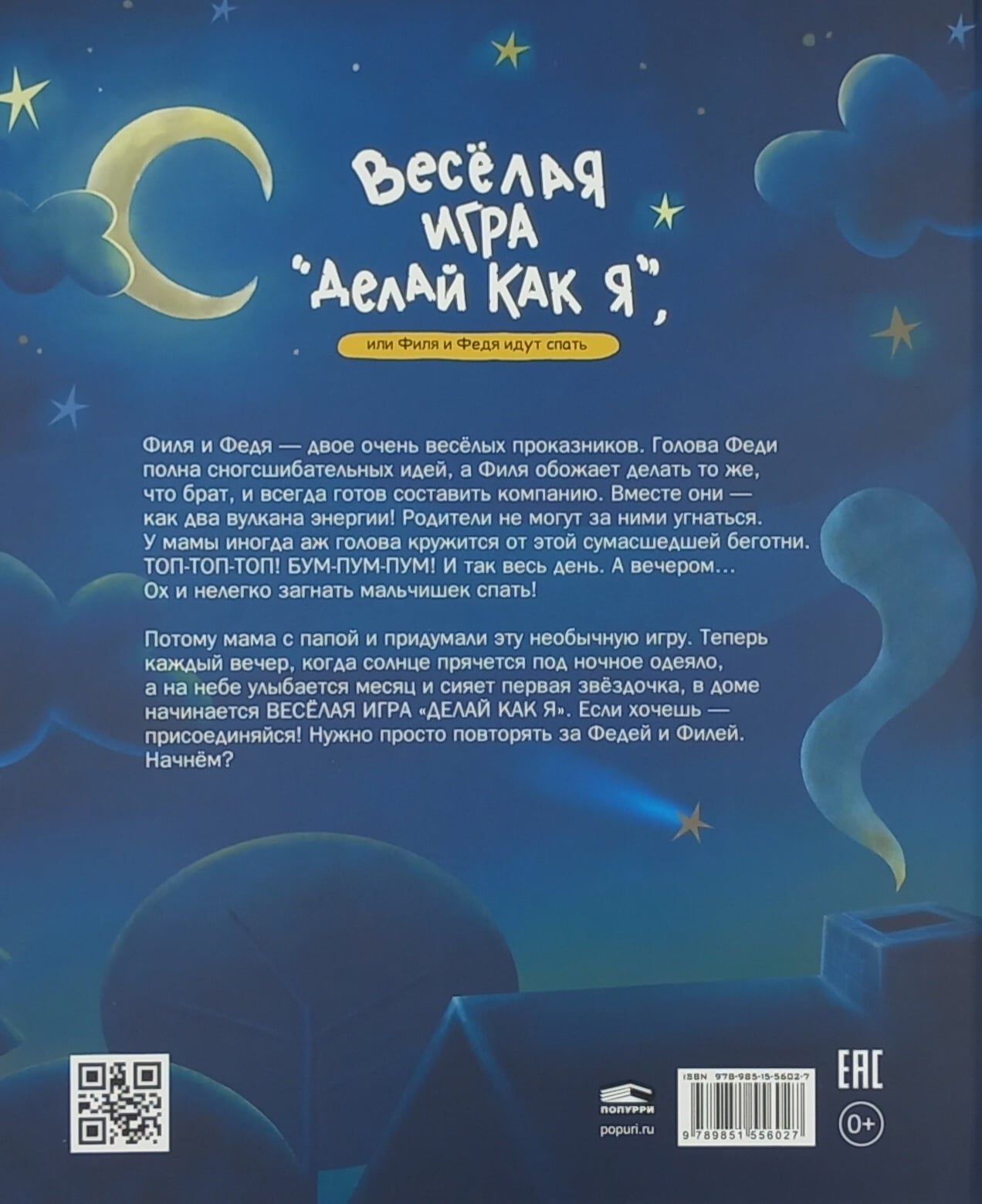 Tāpēc mamma un tētis izdomāja šo neparasto spēli. Tagad katru vakaru, kad saule paslēpjas zem nakts segas, un debesīs iemirdzas mēnesis un uzspīd pirmā zvaigzne, mājā sākas jautra spēle "Dari kā es". Ja vēlaties, pievienojieties! Tev tikai jāseko līdzi Fedijam un Filam. Sāksim?