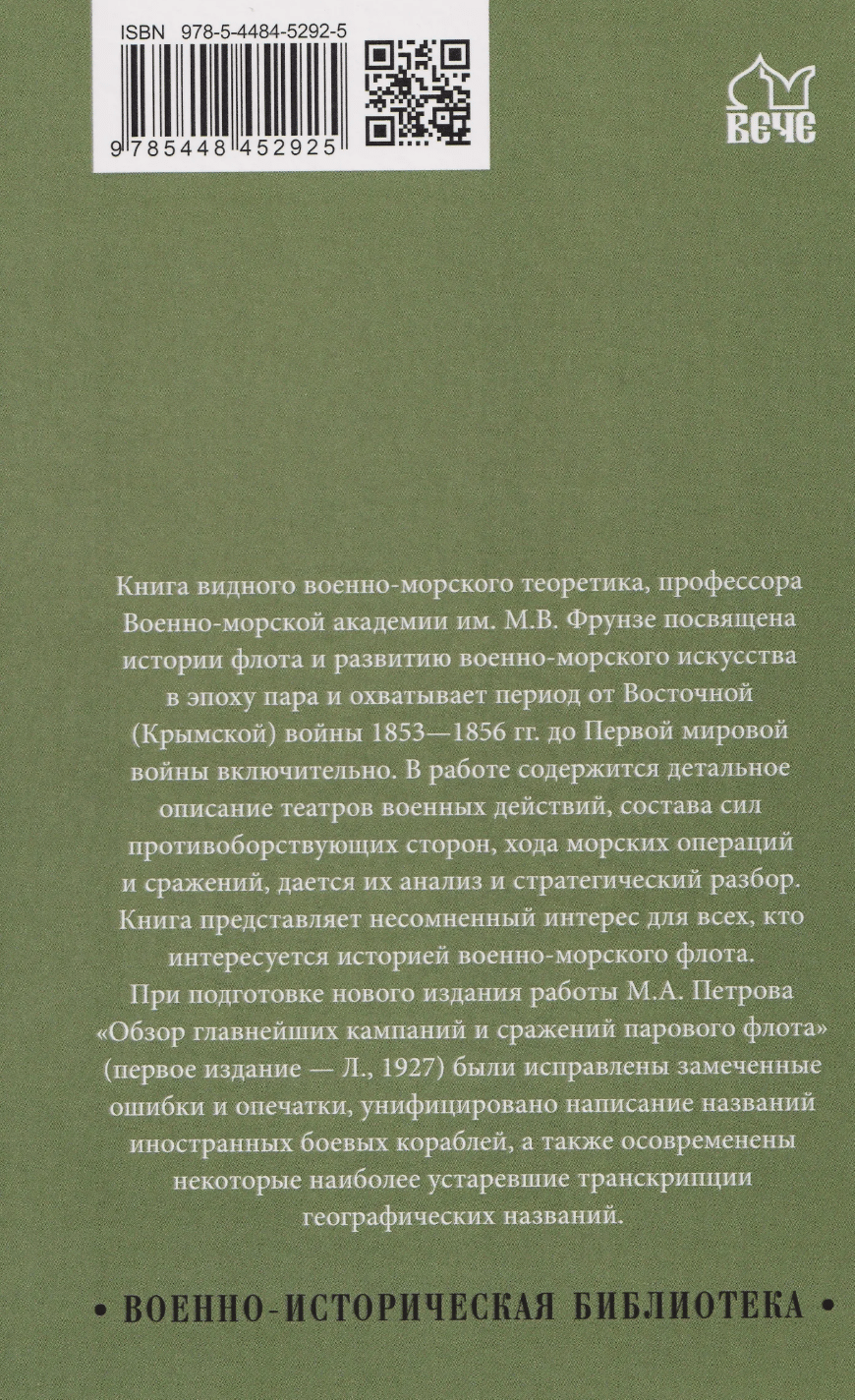 Šī ievērojamā jūras spēku teorētiķa un M. V. Frunzes Jūras akadēmijas profesora grāmata ir veltīta jūras spēku vēsturei un jūras mākslas attīstībai tvaika laikmetā, aptverot periodu no Austrumu (Krimas) kara (1853.–1856. g.) līdz Pirmajam pasaules karam (ieskaitot). Darbā ir sniegts detalizēts militāro operāciju teātri, pretinieku spēku sastāvs, jūras operāciju un kauju gaita, kā arī sniegta analīze un stratēģisks pārskats. Šī grāmata neapšaubāmi interesēs ikvienu, kas interesējas par jūras spēku vēsturi. Sagatavojot šo jauno M. A. Petrova darba "Tvaika flotes galveno kampaņu un kauju pārskats" izdevumu (pirmo reizi izdots Ļeņingradā, 1927. gadā), ir labotas kļūdas un drukas kļūdas, standartizēta ārzemju karakuģu nosaukumu pareizrakstība un atjauninātas dažas novecojušākās ģeogrāfisko nosaukumu transkripcijas.