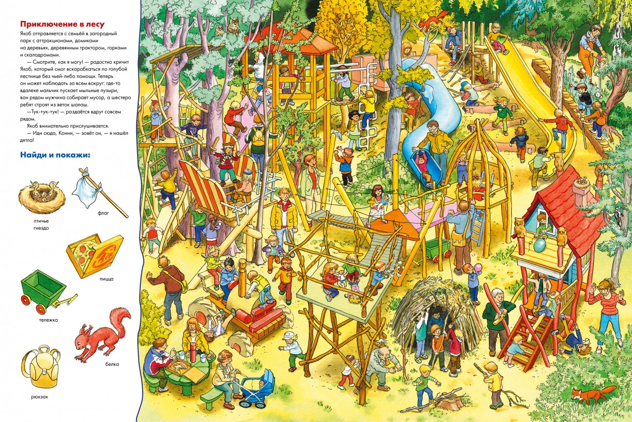 Krāsaina lielformāta wimmelbook ar detalizētām ilustrācijām. Kopā ar iemīļotākajiem varoņiem jūsu bērns dosies aizraujošā pastaigā pa dažādiem rotaļu laukumiem: lēkāt uz batuta, slīdēt pa slidkalniņu akvaparkā un pat palīdzēt pazudušam mazulim atrast mammu. Wimmelbuch - lielisks loģikas, uzmanības un centības treniņš, kā arī iztēles un runas attīstīšana. Spilgtas lielās ilustrācijas ar daudz detaļām un uzdevumiem, lai atrastu priekšmetus, aizraus bērnu un atmodinās viņa zinātkāri. Grāmata ir izgatavota no blīva kartona, lapaspusēm ir noapaļoti stūri mazā lasītāja ērtībai un drošībai.