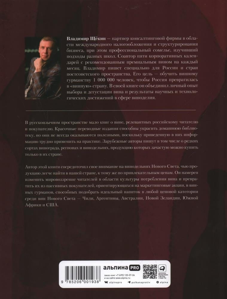 Vīna patēriņa kultūras noslēpumus atklāj astoņu gadu pieredzi guvušais someljē Vladimirs Ščekins. No grāmatas "Vīnoloģija" uzzināsiet, cik daudz jāpiepilda glāze, lai vīns atklātu savu garšu un aromātu; kāpēc lēts dzēriens no Jaunās pasaules var būt labāks par konkurentu no Francijas un Itālijas; kā nepareiza uzglabāšana sabojā pat labāko vīna darītavu produkciju.