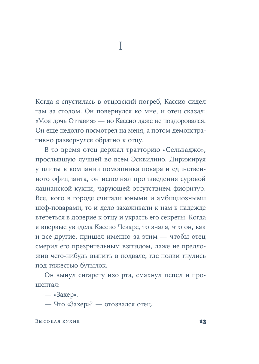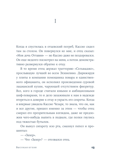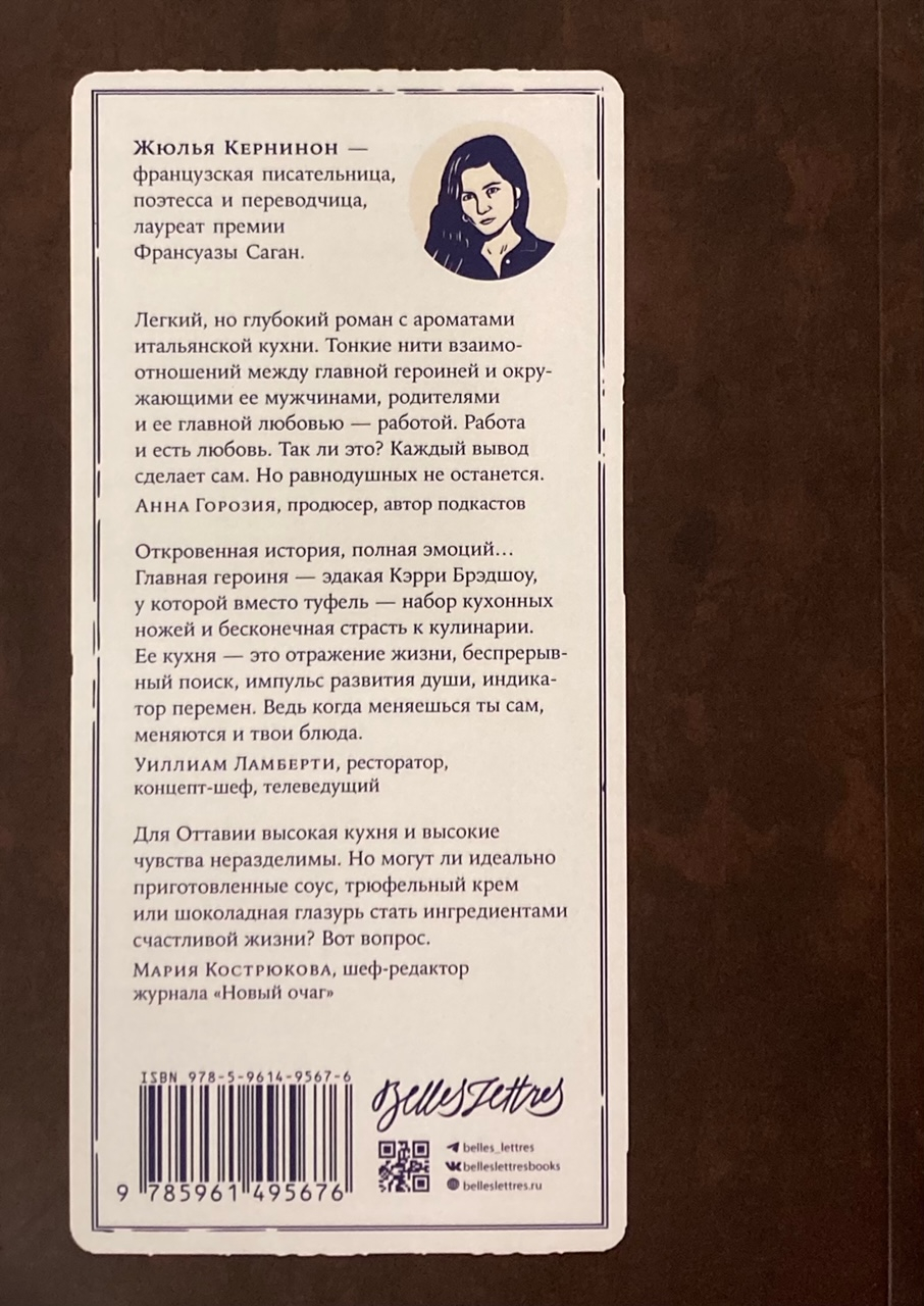 Žils Kerninons stāsta stāstu par spēcīgu sievieti, meklējot sevi. Viņas romāns ir atklāta saruna par attiecībām, ģimeni, likteni un, protams, par haute virtuves maģiju, kas kļūst par varoni un kaisli, un nozīmi, un pestīšanu. Viņa mūs iegremdē Itālijas gaisotnē, kur ēdiens ir māksla un māksla pati ir dzīve. Otavijas ēdieni, tāpat kā viņas dzīves lappuses, ir cerību pilni, bieži vien izmisumā, bet vienmēr mīl.