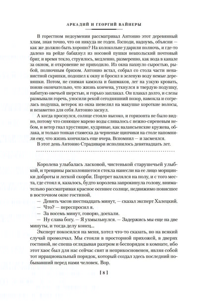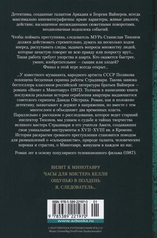Brāļu Veineru, krievu literatūras klasiķu, talanta radītie detektīvi vienmēr ir maksimāli kinematogrāfiski: spilgti raksturi, spraigi dialogi, negaidītu sižeta pavērsienu pilna darbība, neskaidrs notikumu fons. Lai notvertu noziedznieku, MUR izmeklētājam Staņislavam Tihonovam jārīkojas ātri, jādomā vairākus gājienus uz priekšu, jāatrod pēdas, jāuzdod jautājumi daudziem cilvēkiem, kuri bieži vien nesaka visu patiesību vai vienkārši melo… Šāds darbs prasa neatlaidību un aizrautību. Kurš būs ātrāks, gudrāks, atjautīgāks - detektīvs vai ļaundaris? Fināls šajā spēlē vienmēr ir atklāts... Grāmatā iekļauts slavenais romāns "Minotaura apmeklējums" (1972) un romāni "Pulkstenis Kellija kungam" (1967), "Pieskāriens pusdienlaikā" (1968), "Es, izmeklētājs..." (1968). (1968).