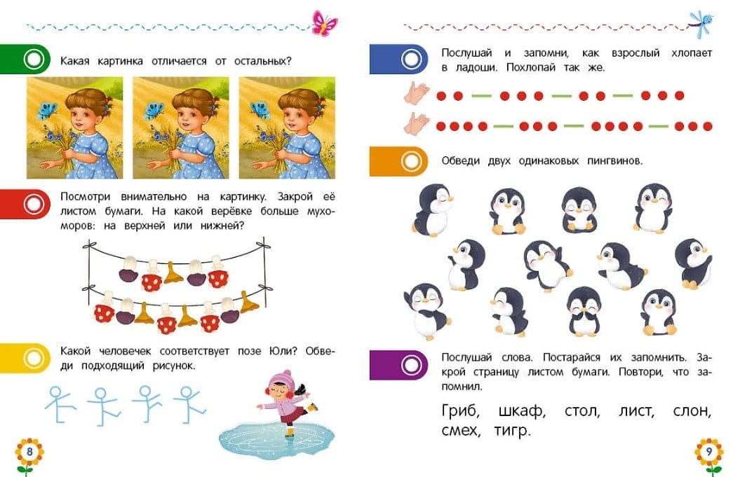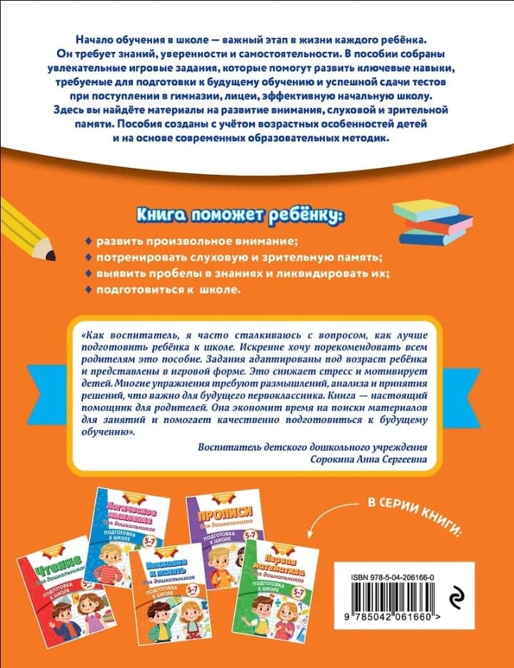 Pirmās klases uzsākšana ir izšķirošs pagrieziena punkts bērna dzīvē, un tai nepieciešama rūpīga sagatavošanās. Šis mācību līdzeklis ietver dažāda veida uzdevumus, kas paredzēti, lai novērtētu pamatprasmju un iemaņu apguvi, kas nepieciešamas tālākai mācībai. Šis resurss palīdz novērtēt pirmsskolas vecuma bērna brīvprātīgās uzmanības, dzirdes un redzes atmiņas attīstību, kā arī spēju pārslēgt un noturēt uzmanību. Tas arī palīdz noteikt, vai bērns var atrast identiskus attēlus un objektus, kas ir identiski kadrā redzamajiem; pabeigt zīmējumu no veidnes; meklēt attēlā paslēpto; saskaņot objektu ar tā ēnu; un pārvilkt līniju saskaņā ar instrukcijām. Mācību līdzeklī sniegtie uzdevumi palīdzēs novērtēt bērna spējas, noteikt veiksmes jomas un izcelt jomas, kurās viņam ir grūtības. Šī izglītojošā grāmata no izdevniecības "Eksmo" ir noderīga meitenēm un zēniem vecumā no 5, 6 un 7 gadiem, gatavojoties skolai.