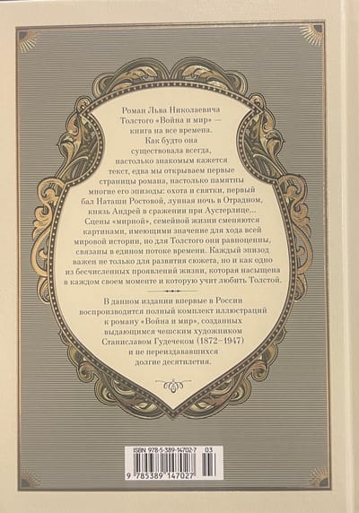 Ļeva Tolstoja romāns "Karš un miers" ir grāmata visiem laikiem. Šķiet, ka tā ir pastāvējusi vienmēr, tik pazīstams šķiet teksts, tikko atveram romāna pirmās lappuses, tik neaizmirstamas ir daudzas tā epizodes: medības un Ziemassvētki, Natašas Rostovas pirmā balle, mēness apspīdētā nakts Otradnojē, princis Andrejs Austerlicas kaujā. "Mierīgas", ģimeniskas dzīves ainas nomaina pasaules vēstures gaitai svarīgas ainas, bet Tolstojam tās ir līdzvērtīgas, savienotas vienā laika plūsmā. Katra epizode ir svarīga ne tikai sižeta attīstībai, bet arī kā viena no neskaitāmajām dzīves izpausmēm, kas ir bagāta ik mirkli un ko Tolstojs māca mīlēt. Šajā izdevumā pirmo reizi Krievijā reproducēts pilns "Kara un miera" ilustrāciju komplekts, ko radījis izcilais čehu mākslinieks Staņislavs Gudečeks (1872-1947) un kas nav pārpublicēts jau vairākus gadu desmitus.