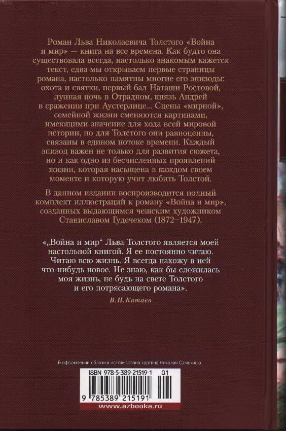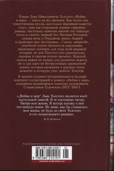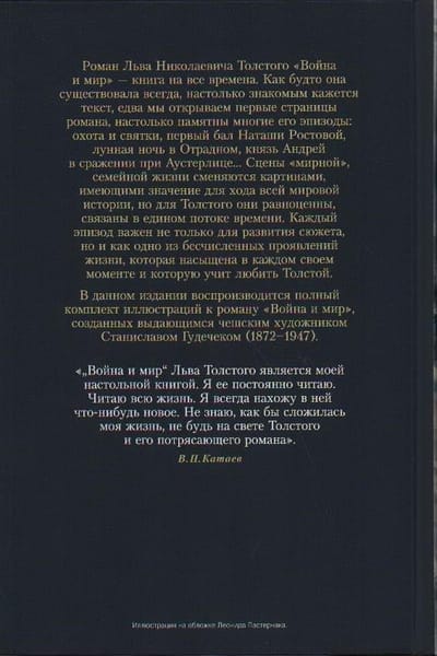 Ļeva Tolstoja romāns "Karš un miers" ir grāmata visiem laikiem. Šķiet, ka tas ir pastāvējis vienmēr, tik pazīstams šķiet teksts, tikko atveram romāna pirmās lappuses, tik neaizmirstamas ir daudzas tā epizodes: medības un Ziemassvētki, Natašas Rostovas pirmā balle, mēness apspīdētā nakts Otradnojē, princis Andrejs Austerlicas kaujā..... "Mierīgas", ģimeniskas dzīves ainas nomaina pasaules vēstures gaitai svarīgas ainas, bet Tolstojam tās ir līdzvērtīgas, savienotas vienā laika plūsmā. Katra epizode ir svarīga ne tikai sižeta attīstībai, bet arī kā viena no neskaitāmajām dzīves izpausmēm, kas ir bagāta katrā mirklī un ko Tolstojs māca mīlēt. Šajā izdevumā reproducēts izcilā čehu mākslinieka Staņislava Gudečeka (1872-1947) ilustrāciju komplekts "Karam un mieram".