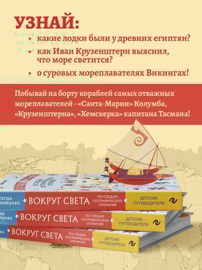 “Apkārt pasaulei pa ģeogrāfisko atklājumu pēdām” ir neticams piedzīvojums, kas aizvedīs uz slaveniem kuģiem – Columbus’s Santa Maria, Kruzenshtern, Captain Tasman’s Heemskerk un daudziem citiem. Šī krāsainā un informatīvā grāmata aizvedīs jūs aizraujošā un dažkārt bīstamā jūrmalnieku pasaulē, kuri uzdrošinājās kuģot nezināmos ūdeņos. Jaunie lasītāji pievienosies vikingiem savā pirmajā ceļojumā, atklās Jauno pasauli un apbrauks apkārt pasaulei tādā veidā, kas uz visiem laikiem mainīja mūsu izpratni par planētu.