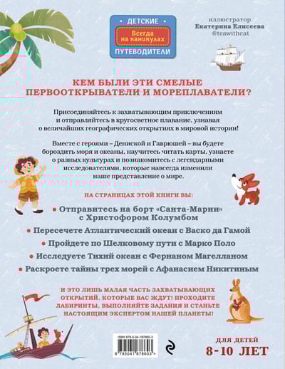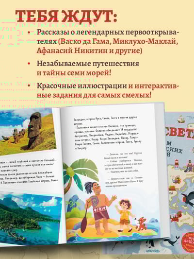 Atklāj septiņu jūru noslēpumus! Dzirdēsiet stāstus par leģendāriem pētniekiem, kuri kuģoja okeāna plašumus, atklājot jaunas zemes un paplašinot cilvēku zināšanas. Uzziniet par Vasko da Gamas, Džeimsa Kuka, Miklouho-Maklaja, Afanasija Ņikitina un citu drosmīgu jūrmalnieku, kuru piedzīvojumi iedvesmo pētnieku paaudzes, ievērojamajiem varoņdarbiem.