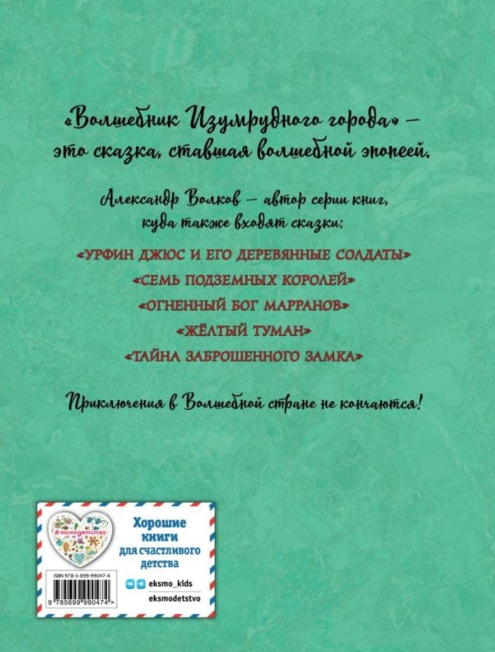 Šī ir slavena A. Volkova pasaka, kas kļuvusi par maģisku eposu. Maģiska viesuļvētra meiteni Eliju un viņas māju aizved uz noslēpumainu zemi. Pa dzelteniem ķieģeļiem bruģētu ceļu viņa kopā ar saviem jaunajiem draugiem dodas uz Smaragda pilsētu, cerot, ka tās valdnieks, dižens burvis, varēs palīdzēt viņai atgriezties mājās. Grāmatu ilustrējusi mūsdienu māksliniece Anna Vlasova.