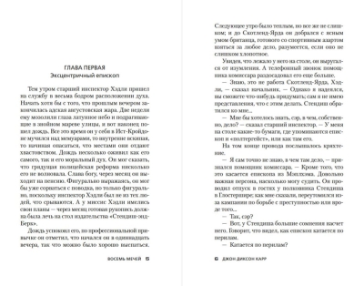 1933. gadā Džona Diksona Kāra romāns "Raganas midzenis" pirmo reizi iepazīstināja sabiedrību ar amatieru detektīvu Dr. Gideonu Felu. 1934. gadā publicētais romāns "Astoņi zobeni" ir stāsts par ekscentriskā Dr. Fela trešo izmeklēšanu. Šoreiz viņam jānoskaidro doktora Septima Depinga noslēpumainās nāves apstākļi, kurš tika atrasts guļam uz sava rakstāmgalda, daudznozīmīgi turot rokā Taro kārti ar astoņiem sīkiem zobeniem...
