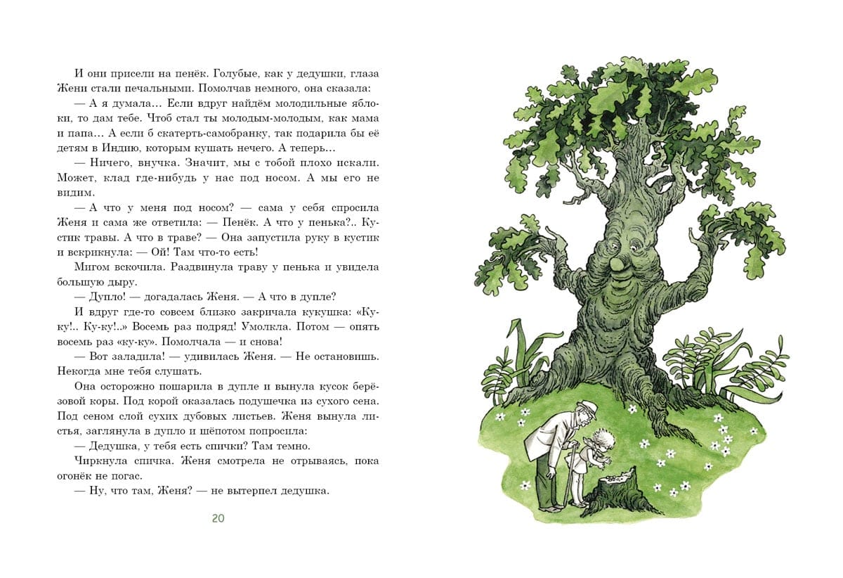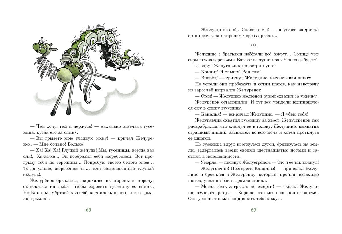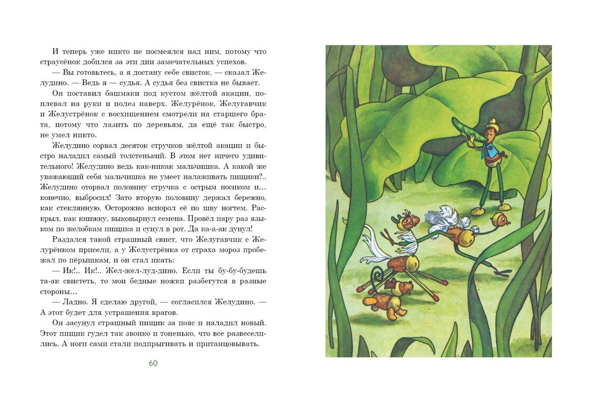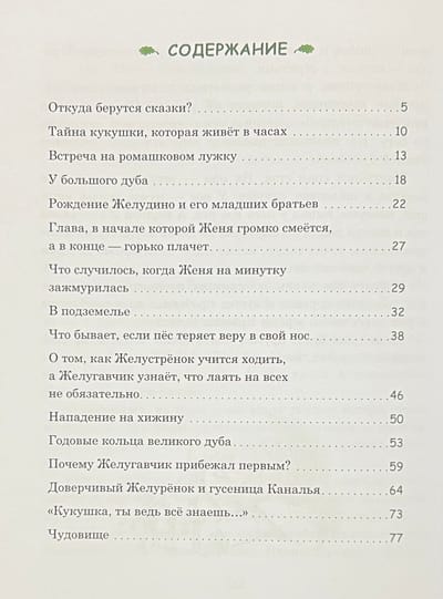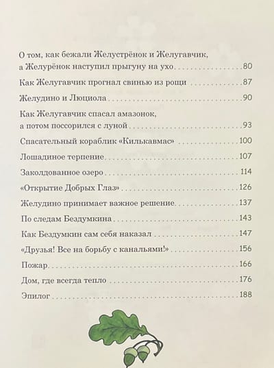 Pasaku stāsts par mazu meitenīti vārdā Žeņa un astoņiem burvju ozolzīlēm. Ar stieples un sērkociņu, spalvu un papeļu pūkas palīdzību Žeņjas vectēvs pārvērta tos par zēnu Želudiņu, strausu Želustrionoku, kumeļu Želurjonku un suni Želugavčiku. Uzzināsiet, kā drosmīgie varoņi mežā cīnījās ar kāpuriem, no kuriem glāba kukaiņus un putnus, kas ir "Labo acu atklājums" un kāpēc ir tik svarīgi saudzīgi izturēties pret dabu. Grāmatu ilustrējis bērnu grāmatu ilustrāciju meistars Henrijs Oskarovičs Valks.