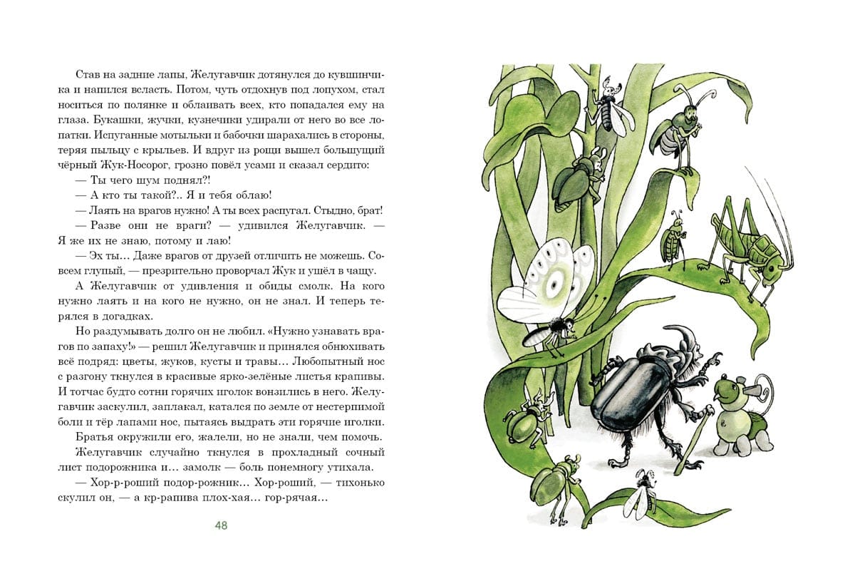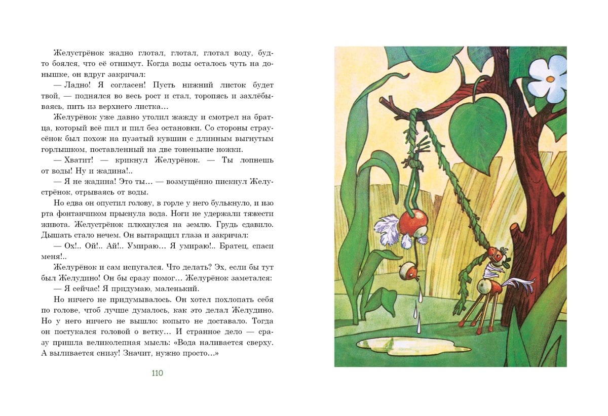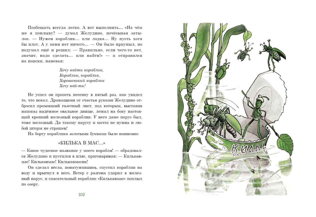 Pasaku stāsts par mazu meitenīti vārdā Žeņa un astoņiem burvju ozolzīlēm. Ar stieples un sērkociņu, spalvu un papeļu pūkas palīdzību Žeņjas vectēvs pārvērta tos par zēnu Želudiņu, strausu Želustrionoku, kumeļu Želurjonku un suni Želugavčiku. Uzzināsiet, kā drosmīgie varoņi mežā cīnījās ar kāpuriem, no kuriem glāba kukaiņus un putnus, kas ir "Labo acu atklājums" un kāpēc ir tik svarīgi saudzīgi izturēties pret dabu. Grāmatu ilustrējis bērnu grāmatu ilustrāciju meistars Henrijs Oskarovičs Valks.